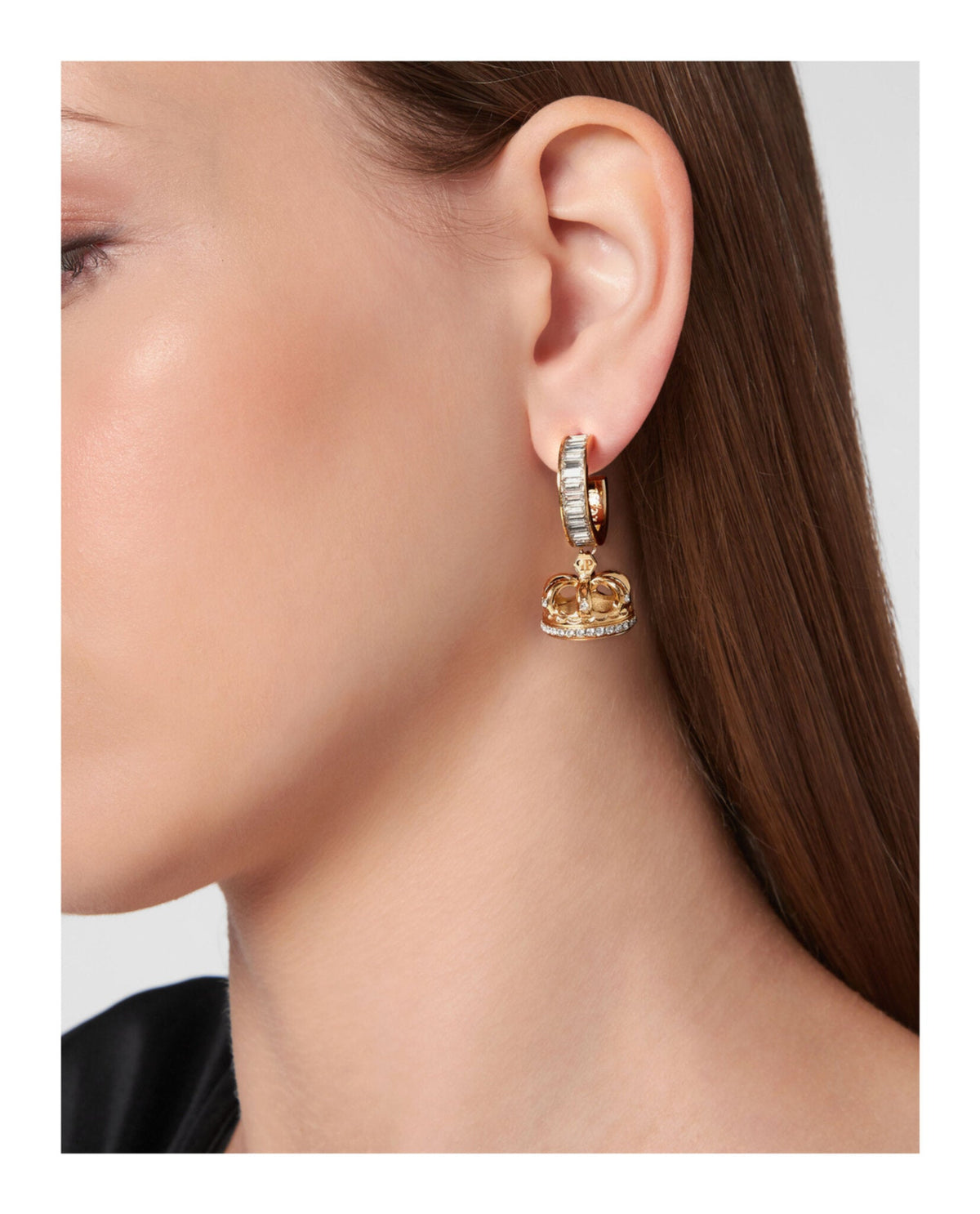 The $kull Crown Crystal Hoop Earrings by Philipp Plein are a stunning pair that add drama and sophistication to any look. Crafted with 66 Preciosa crystals, these earrings sparkle with every movement. Perfect for evening wear or special occasions, the 1.37-inch hoops exude glamour.