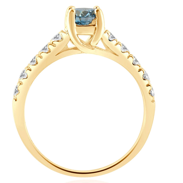 This .60Ct Blue & White Diamond Engagement Ring in 14k Yellow Gold by Pompeii3 features a 1/3ct round brilliant cut blue enhanced diamond as the center stone, surrounded by white accent diamonds that encircle the band. The channel-set diamonds in solid 14k yellow gold add an elegant touch.
