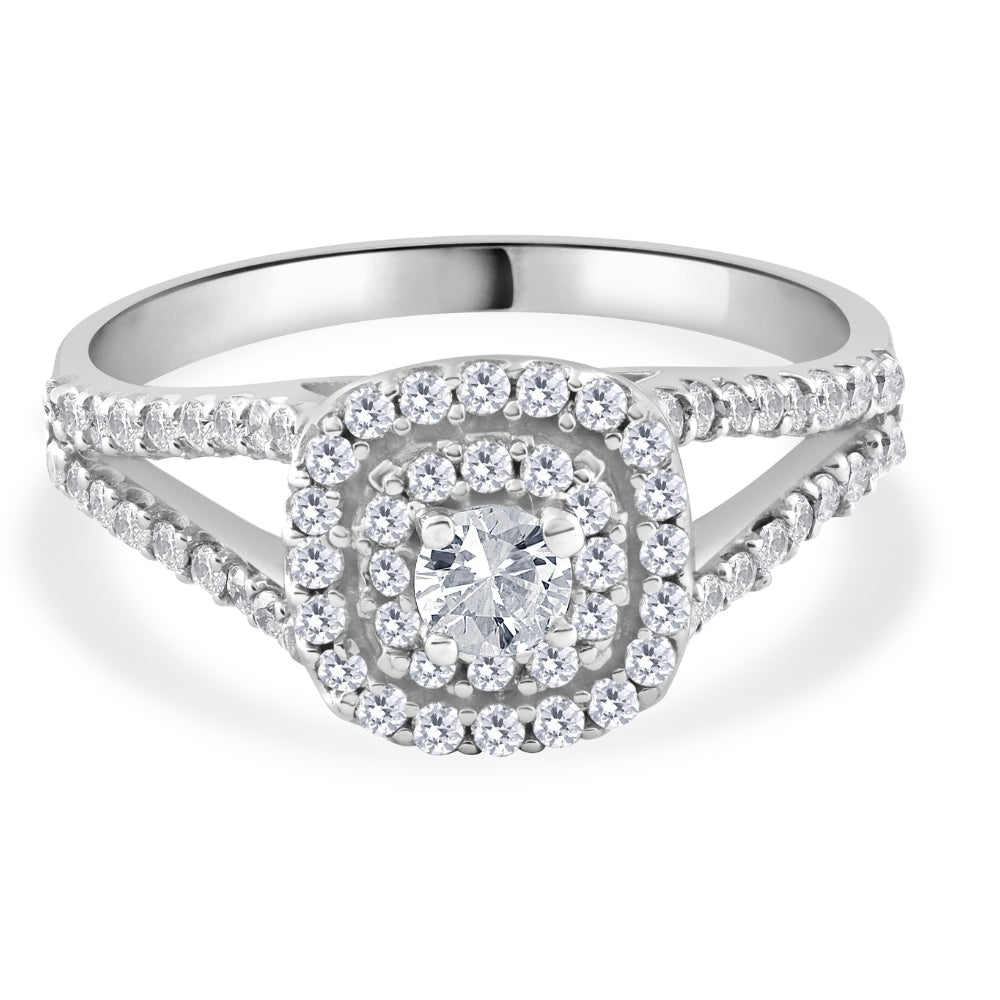 Made from solid 10K white gold, set with 69 round-cut diamonds totaling 1ct. The diamonds are prong set in a high-polished double cushion halo mounting.