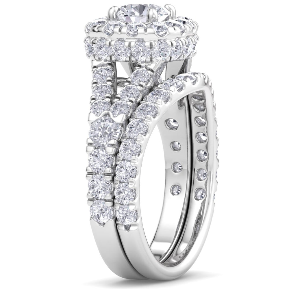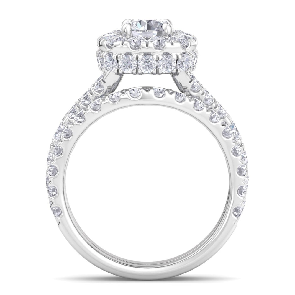 This 3 1/2Ct Cushion Halo Split Ring Diamond Engagement Set in White, Yellow, Rose Gold by Pompeii3 features a stunning 3/4ct round-cut genuine diamond as the centerpiece, with side stones that wrap around the ring for a dramatic effect. The prong setting ensures each stone sparkles beautifully. The matching wedding band completes the set, offering a perfect, cohesive look. This ring's arrangement and sparkle make it a showstopper.