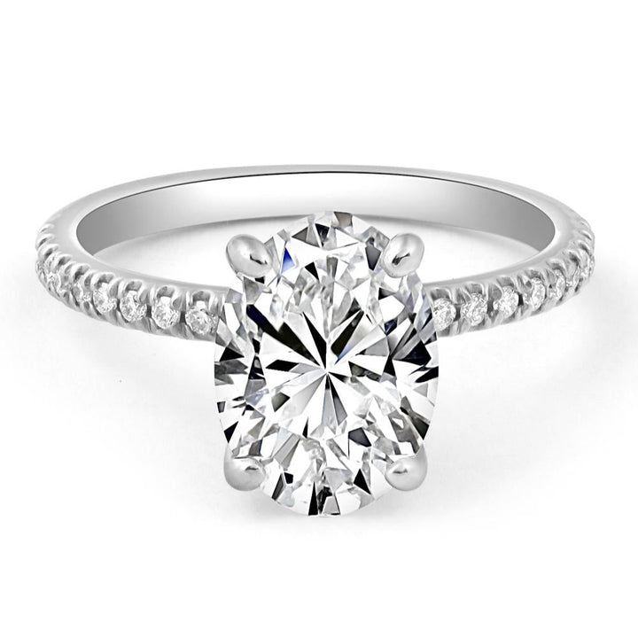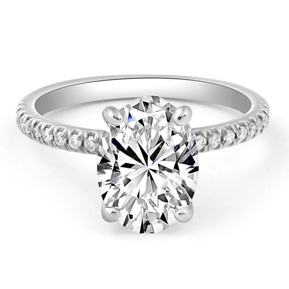 Set in solid 14k white gold with a 3 1/4ct oval lab-grown center diamond and 22 round-cut accent diamonds.