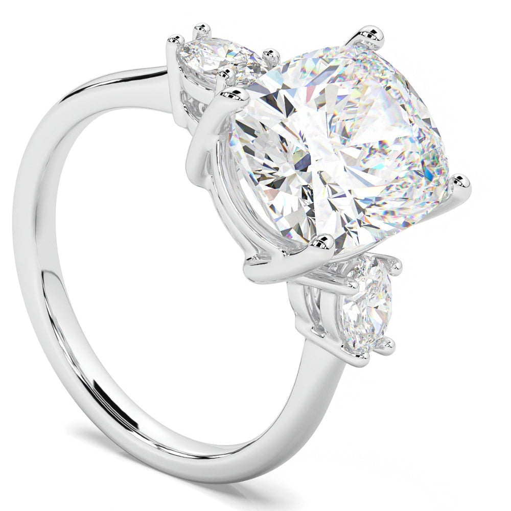 Set in solid 14K white gold, featuring a 5 ct certified cushion cut lab-grown diamond with two oval cut accent diamonds. All stones are prong-set in a high-polished mounting for a refined look.