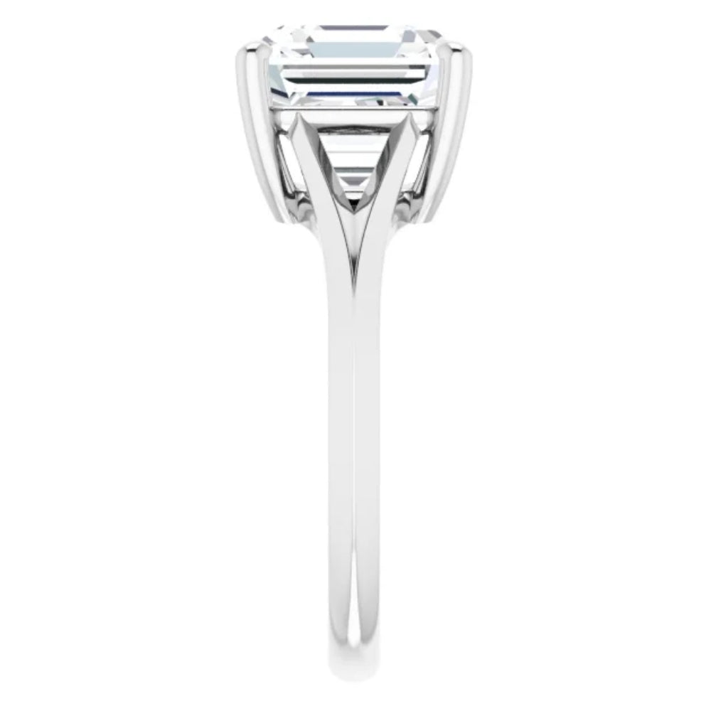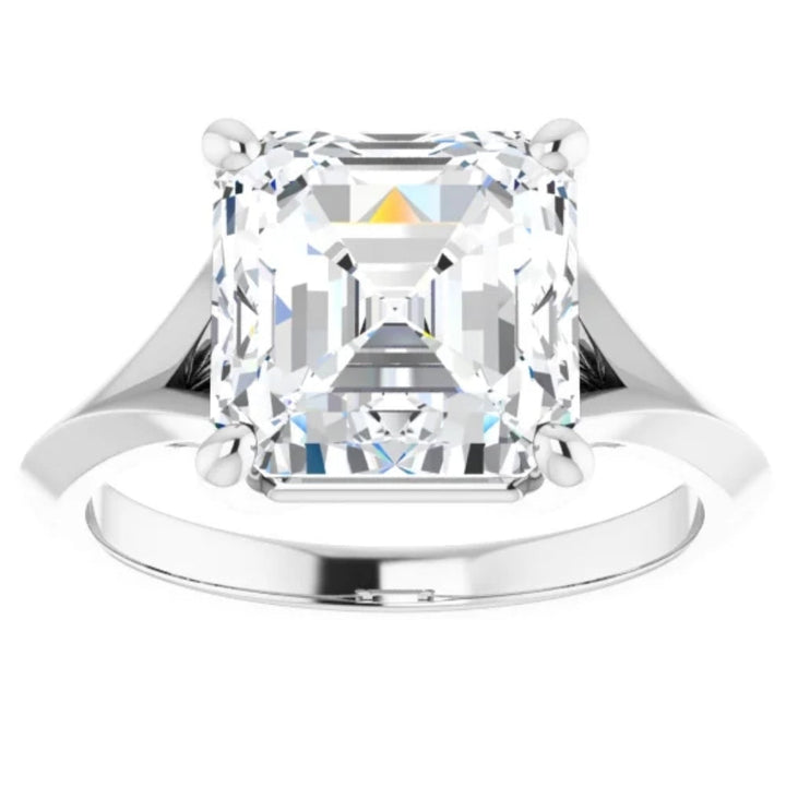 Set in solid 14k white or yellow gold with a 9mm asscher cut moissanite in a prong-set split shank design.