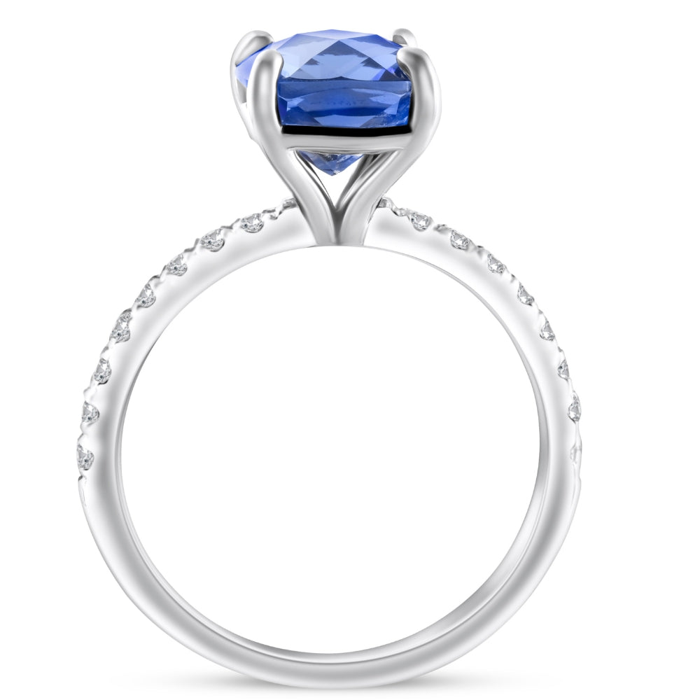 This VS 2 1/3Ct TW Cushion Blue Sapphire & Diamond Ring by Pompeii3 features a 7mm checkerboard created blue cushion shaped sapphire, surrounded by 16 round accent diamonds. Set in solid 14k white gold, this ring combines the elegance of blue sapphire with the brilliance of diamonds.
