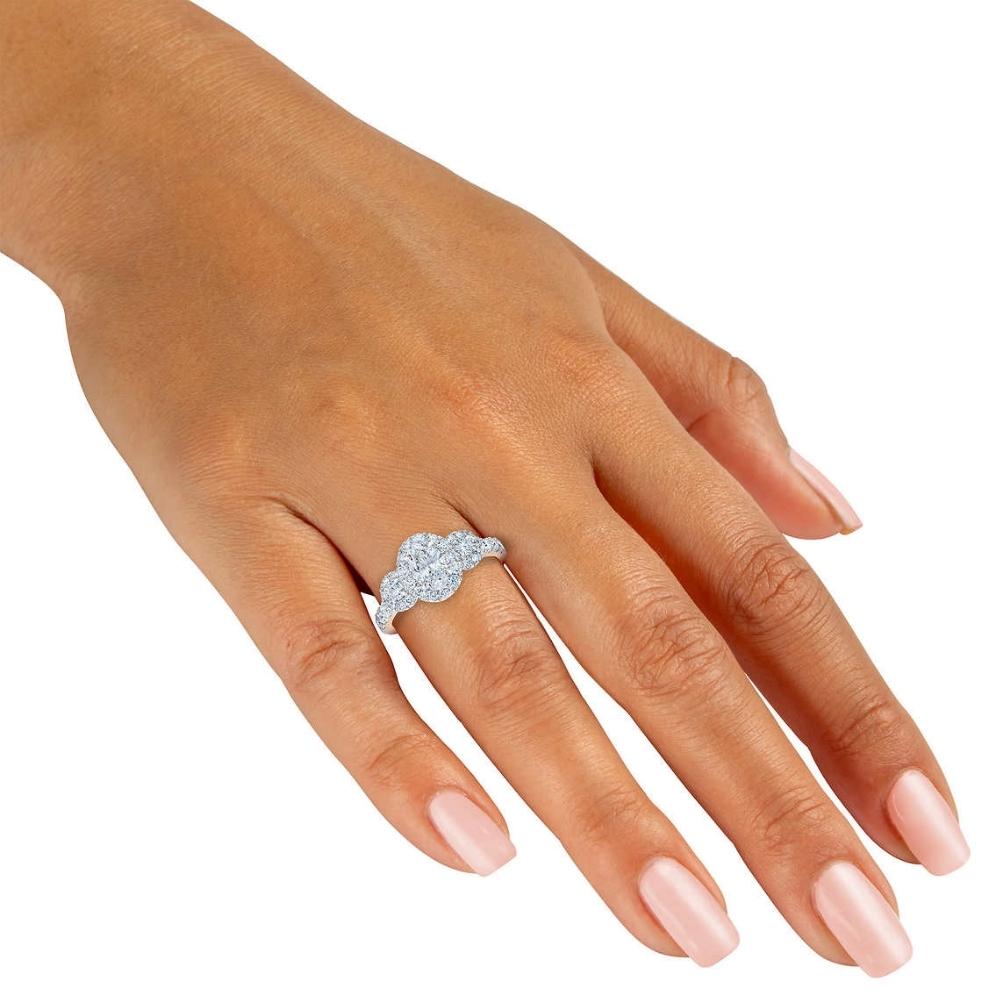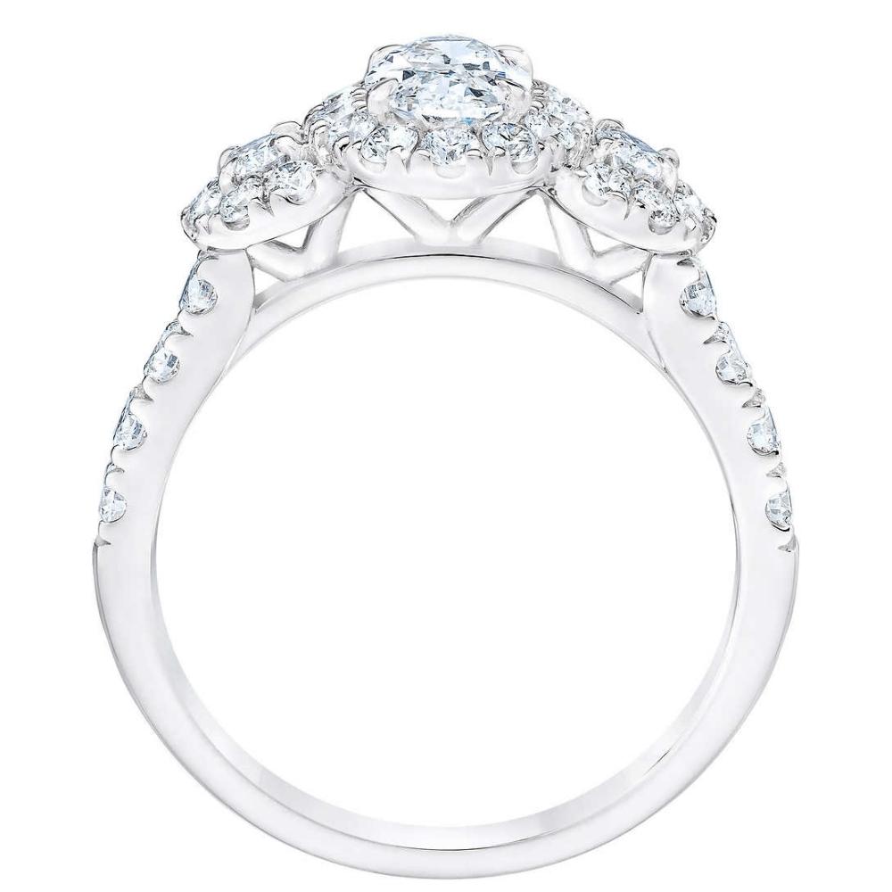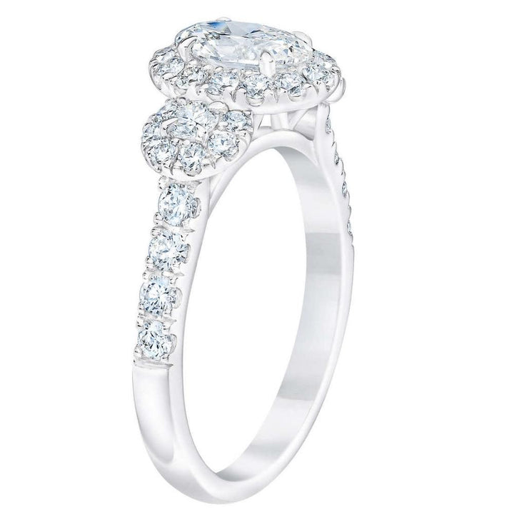 This 1 1/3Ct Oval Halo 3-Stone Diamond Engagement Ring by Pompeii3 is romantic and dazzling. A center oval diamond is accented by sparkling round cut diamonds in a delicate halo design set in high-polished 10k white gold.