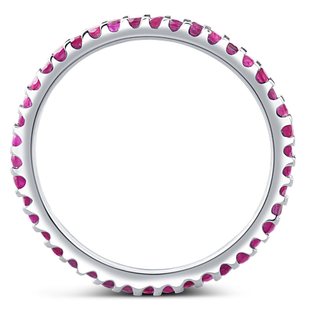 This 3/4Ct Ruby Eternity Ring Anniversary Band 10k White Gold by Pompeii3 is a stunning ring featuring genuine rubies set in a continuous circle around the band. The prong-set rubies are set in a high-polished 10k white gold band, offering a pop of color and making it the perfect piece to stack with other rings or wear as a standalone statement.