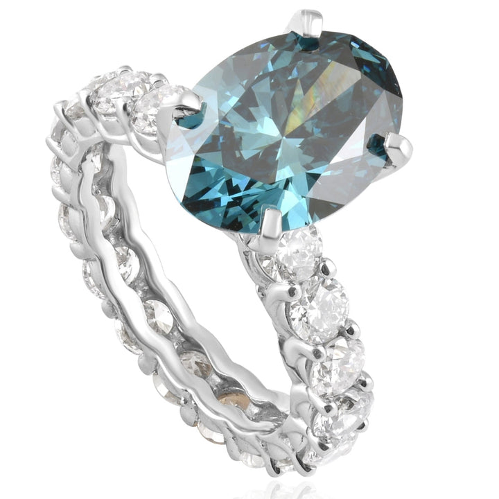 This 6Ct Blue & White Diamond Engagement Eternity Ring by Pompeii3 features a stunning 3ct oval brilliant-cut lab-grown enhanced diamond at It's center, flanked by round-cut accent diamonds. Set in solid 14K high-polished white gold, this elegant and timeless eternity ring is perfect for celebrating love and commitment. The combination of blue and white diamonds adds an exceptional sparkle, making this a statement piece for any engagement or anniversary.