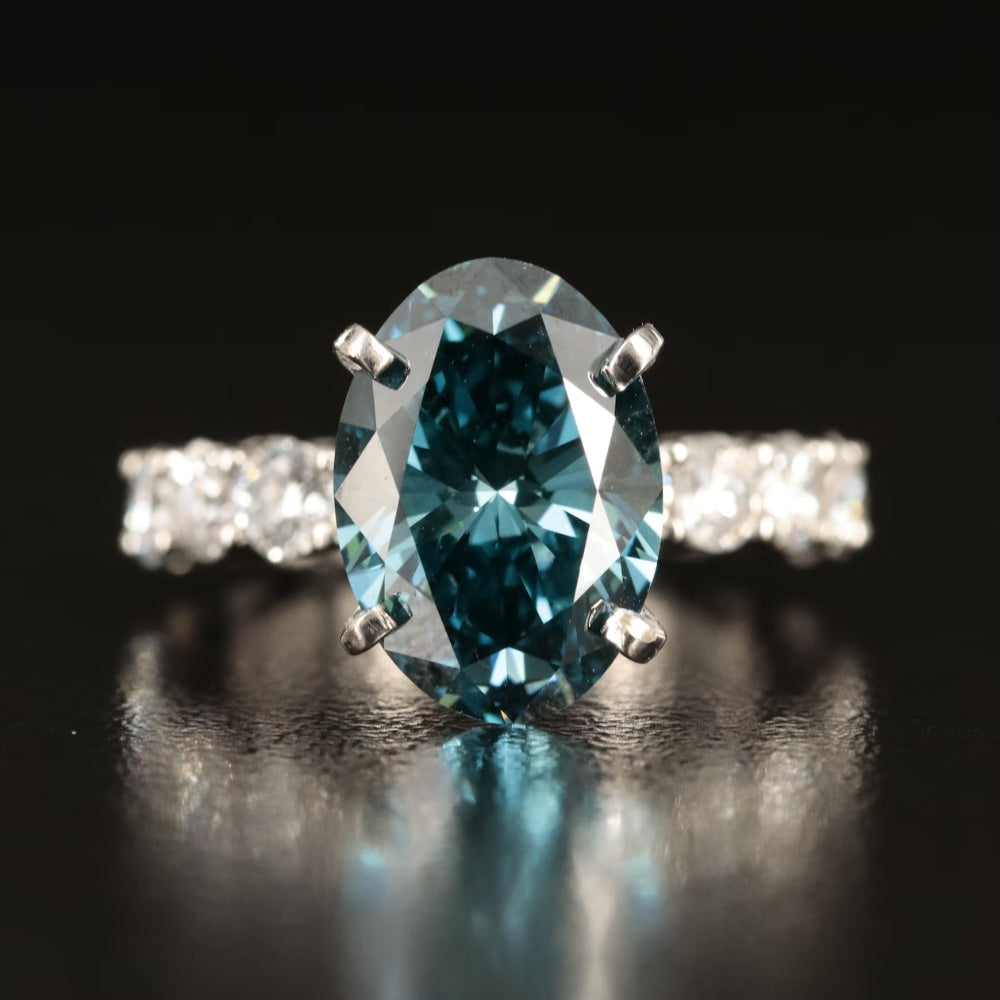 Crafted from solid 14K white gold, featuring a 3ct oval brilliant-cut lab-grown enhanced diamond and round-cut accent diamonds totaling 6ct. All diamonds are prong set.