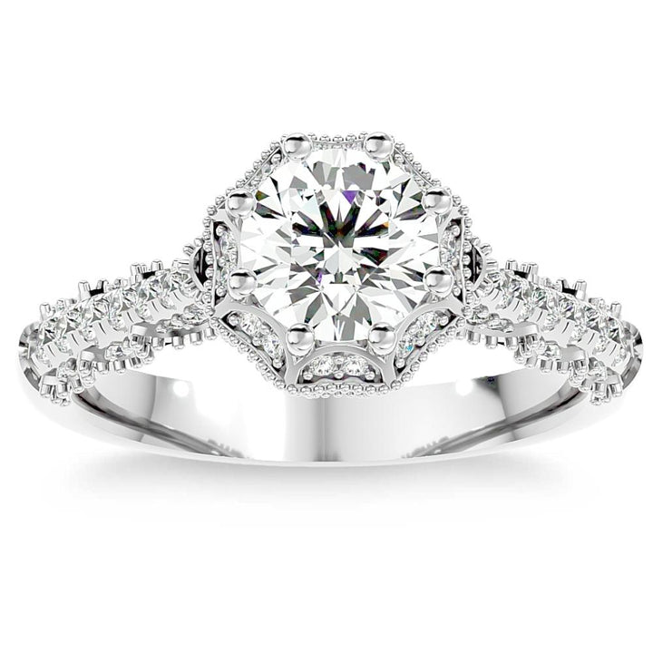 This 1 1/10ct Vintage Diamond & Moissanite Halo Engagement Ring by Pompeii3 exudes antique-inspired charm. A 6mm round moissanite center is surrounded by 56 sparkling accent diamonds, perfect for a romantic proposal.