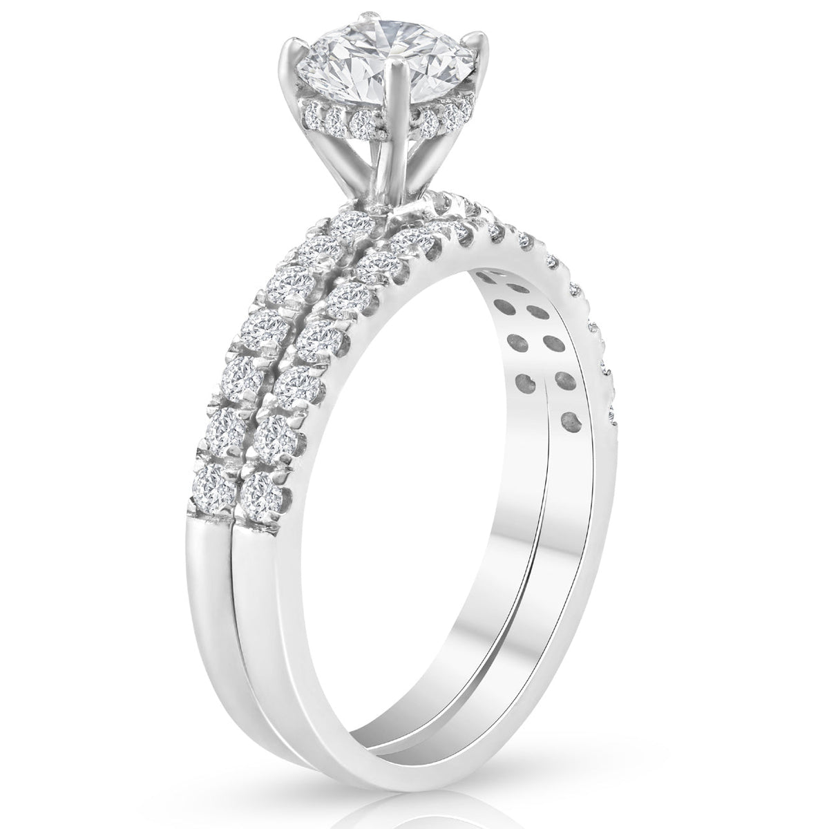 This 1 3/4 Ct Diamond Engagement Wedding Set in 14k White Gold by Pompeii3 features a 3/4ct round cut genuine enhanced diamond at the center, surrounded by lab-grown diamonds. The prong-set diamonds are mounted in solid 14k white gold for a timeless and classic design. The matching wedding ring is included to complete the set.