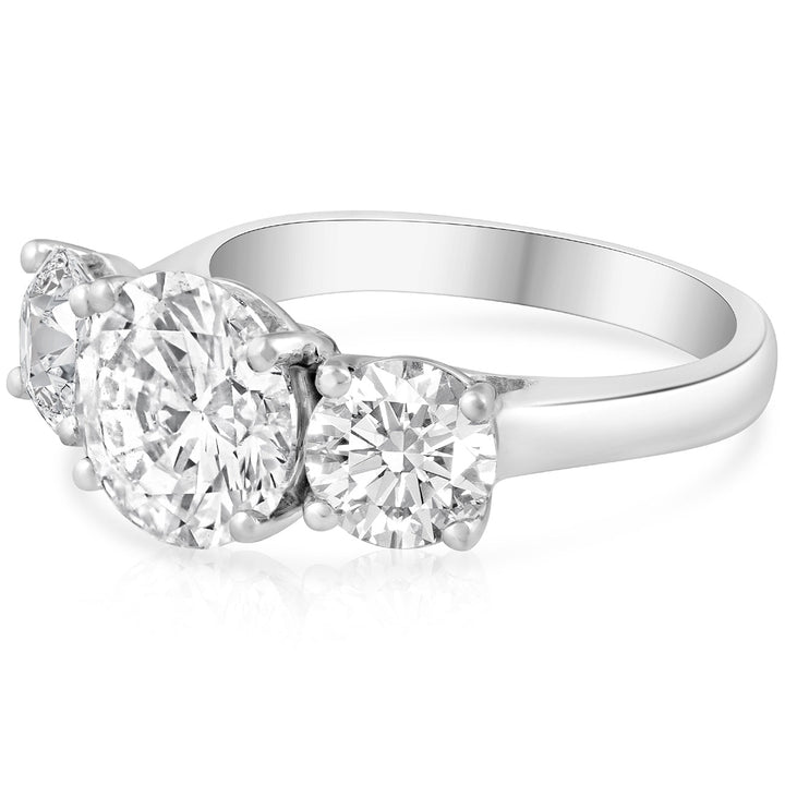 The 5Ct Three Stone Moissanite Ring by Pompeii3 is bold and breathtaking. Featuring a 9mm center moissanite flanked by two 7mm stones, this white gold setting is perfect for those who love modern, head-turning sparkle.