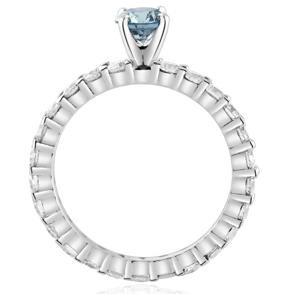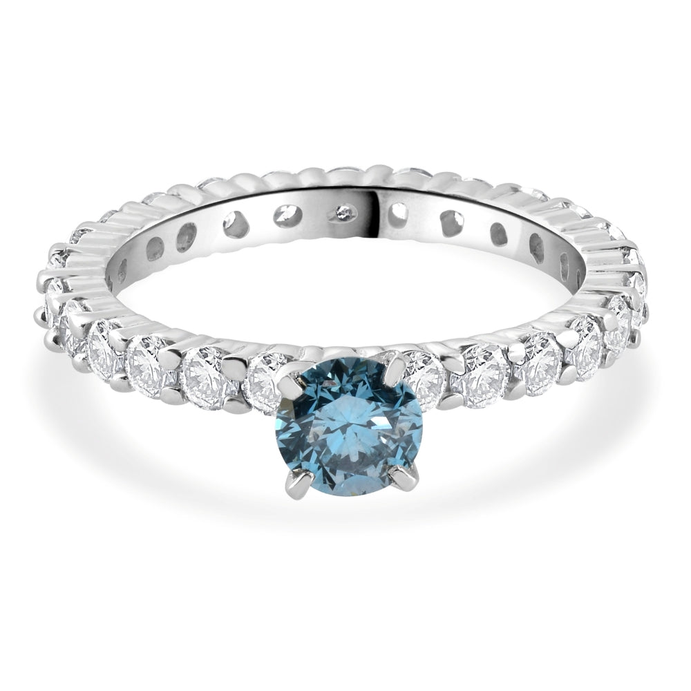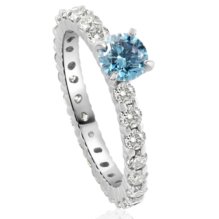 This 1 1/3Ct Blue & White Diamond Eternity Engagement Ring by Pompeii3 features a captivating 1/3ct round brilliant-cut blue enhanced diamond at the center, surrounded by sparkling white accent diamonds. Set in solid 14K high-polished white gold, this ring combines bold color and timeless elegance. It's eternity design ensures a continuous flow of diamonds, symbolizing eternal love.
