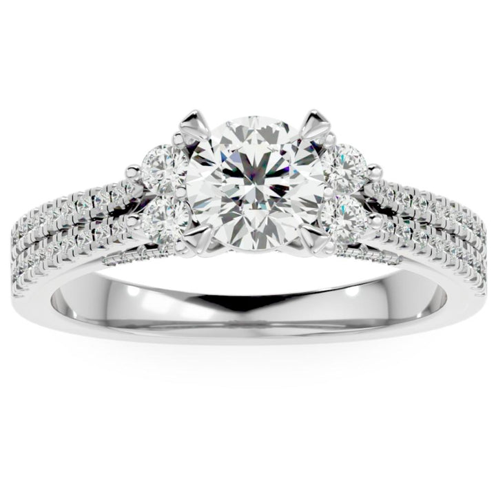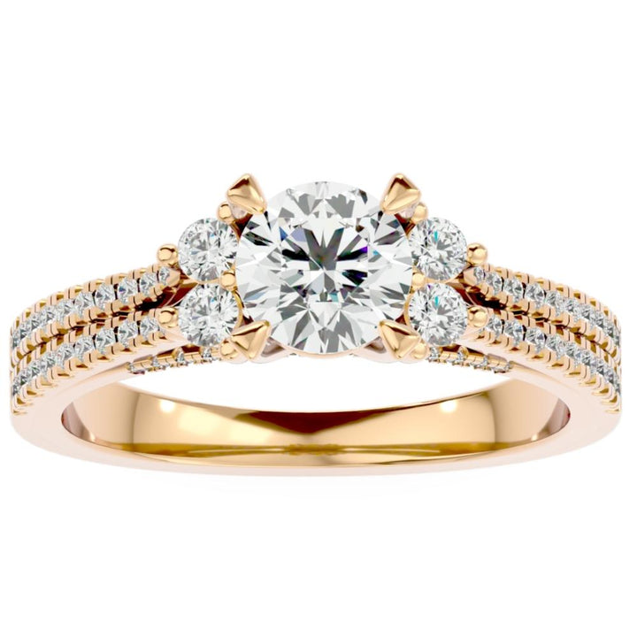 This 1 1/3Ct Diamond Engagement Ring in White, Yellow, or Rose Gold Lab Grown by Pompeii3 features a 3/4ct round-cut center lab-grown diamond, accented by 74 round brilliant-cut diamonds. The diamonds are prong-set in solid 10k gold, with a high-polish pave mounting.