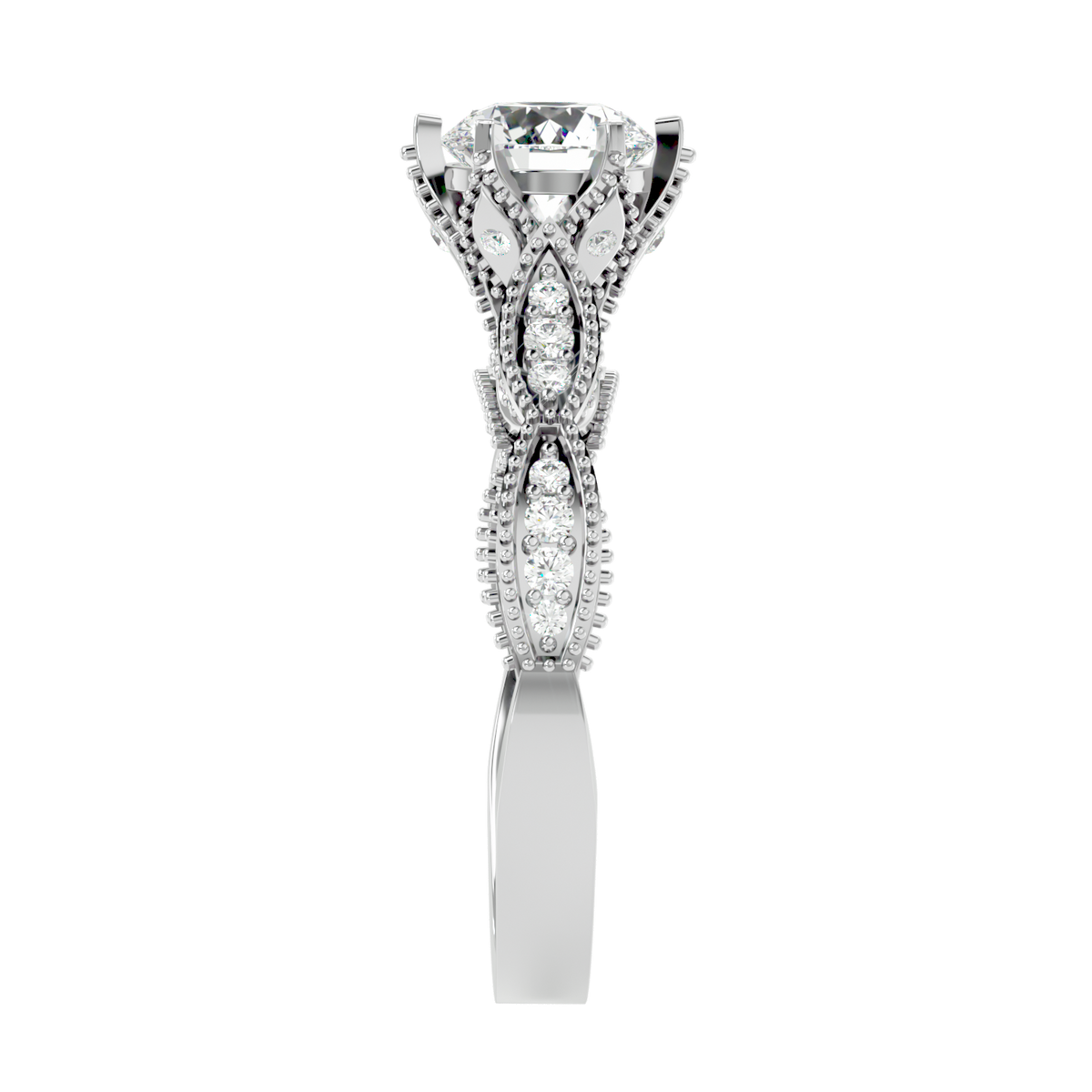 Handcrafted in solid 10k white, yellow, or rose gold with a 6mm round brilliant-cut moissanite and 48 round-cut diamond accents. Diamonds graded I2-I3 clarity, H-I color. Prong-set in a vintage-inspired halo setting.