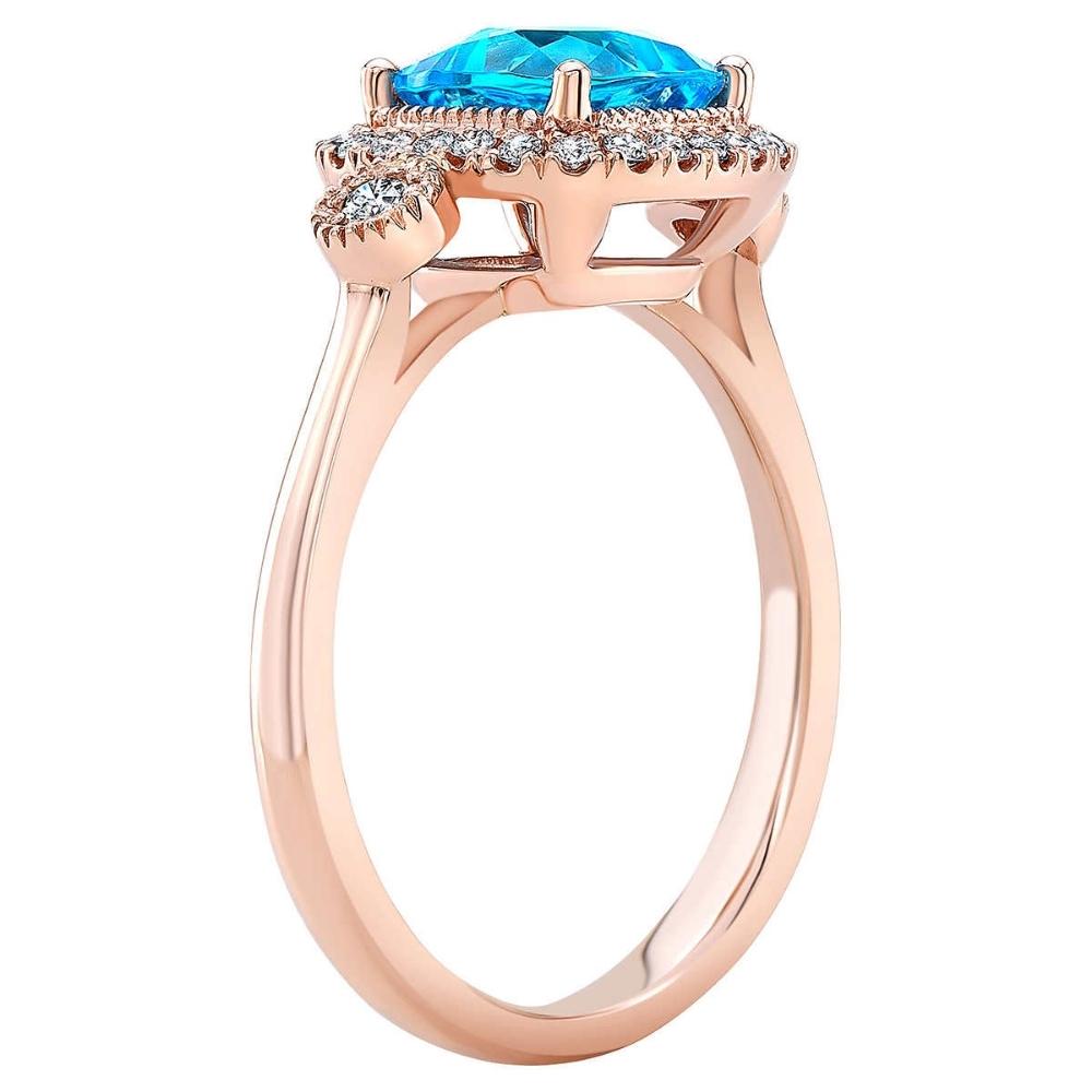 Handcrafted in solid 14k rose gold with a 7mm checkerboard-cut genuine blue topaz and 26 round-cut diamonds. Diamonds graded I2-I3 clarity, G-H color. Prong-set in a polished halo design.