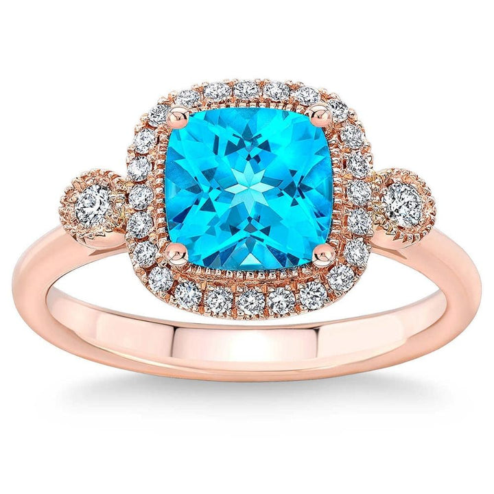 2 ct TW Blue Cushion Topaz & Diamond Halo Engagement Ring in 14k Rose Gold