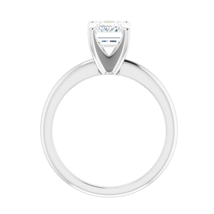 Crafted from solid 14K white, yellow, or rose gold, featuring an 8x6mm emerald-cut moissanite totaling 2ct. The stone is prong set in a high-polished gold mounting.