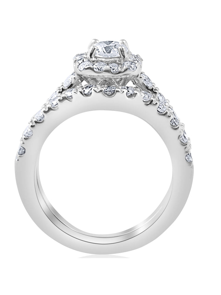 Handcrafted in solid 14k white gold with round brilliant-cut lab-grown diamonds totaling approximately 1.10 carats. Diamonds graded SI clarity. Prong-set in a polished cushion halo mounting. Matching wedding band included.
