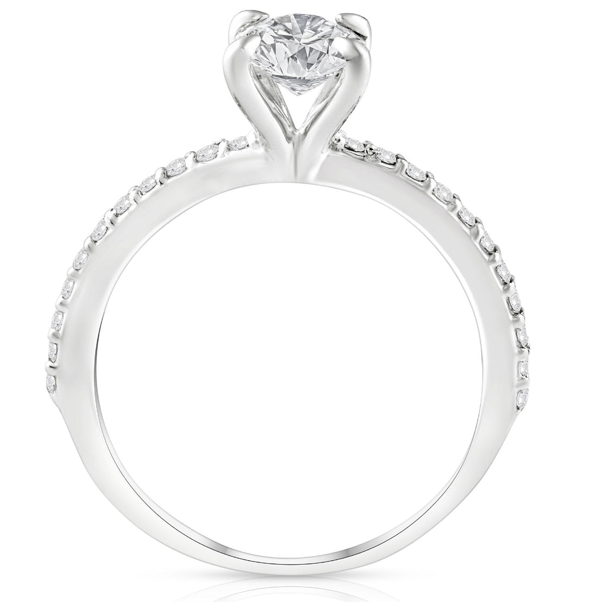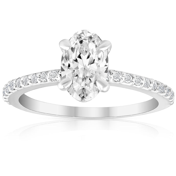 This 1 1/2Ct Oval Diamond Engagement Ring with Sidestones by Pompeii3 is an elegant and dazzling choice. A 1ct oval enhanced diamond is complemented by 22 round-cut accent diamonds, all prong-set in a polished white gold band for maximum brilliance.