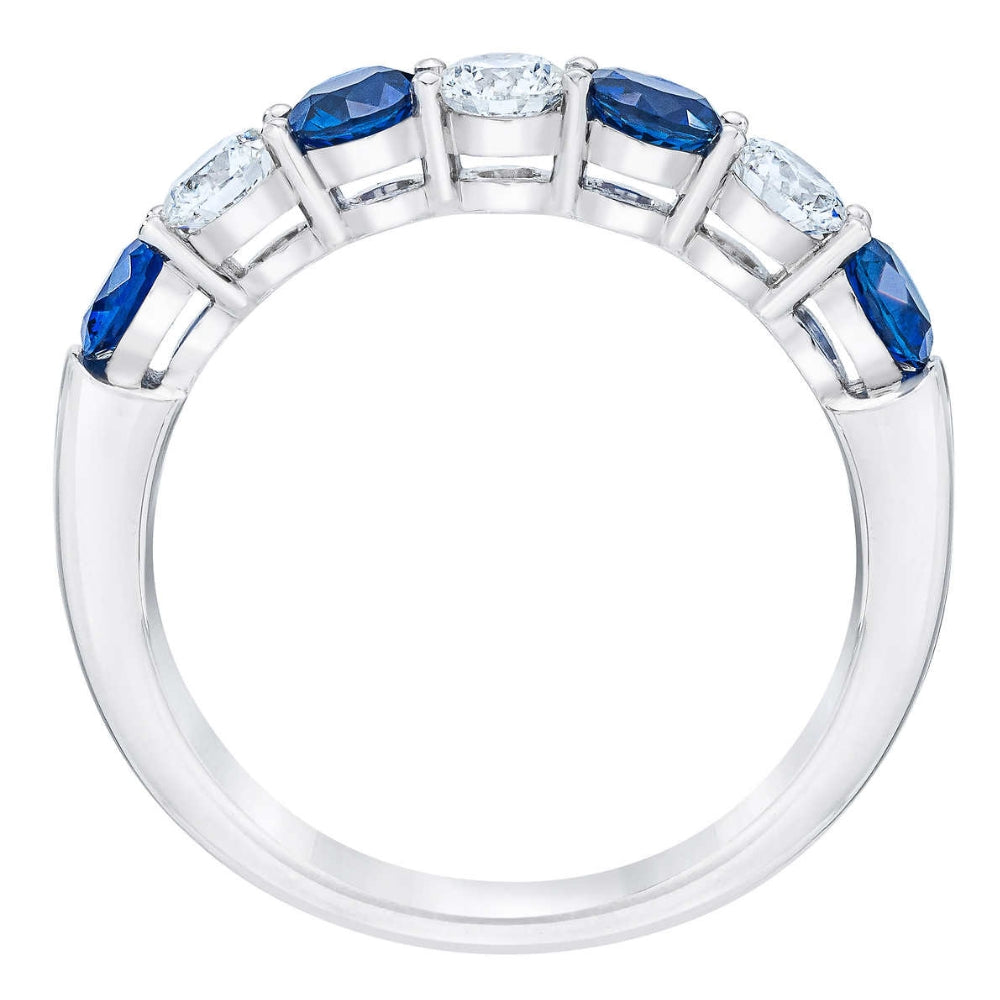 This 1 1/2Ct TW Round Diamond & Created Blue Sapphire Stackable Ring in 14K Gold by Pompeii3 combines the beauty of round brilliant cut diamonds and created blue sapphires in a stunning stackable design. The alternating diamonds and sapphires are set in solid 14K gold with a polished prong setting, offering a touch of color and sparkle. This piece is perfect for stacking or adding to any jewelry collection.