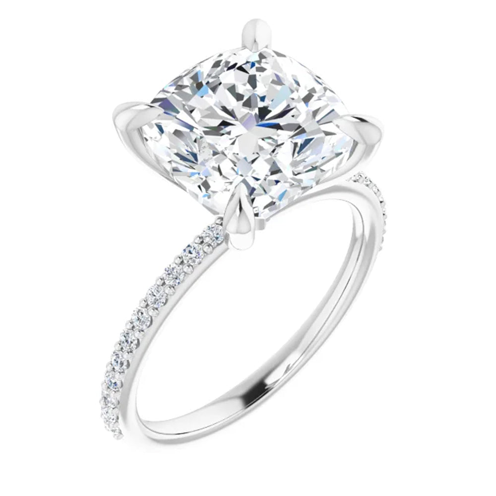 Solid 14k white gold with a 9mm cushion shape moissanite and round cut accent diamonds. Set in a high-polished mounting.