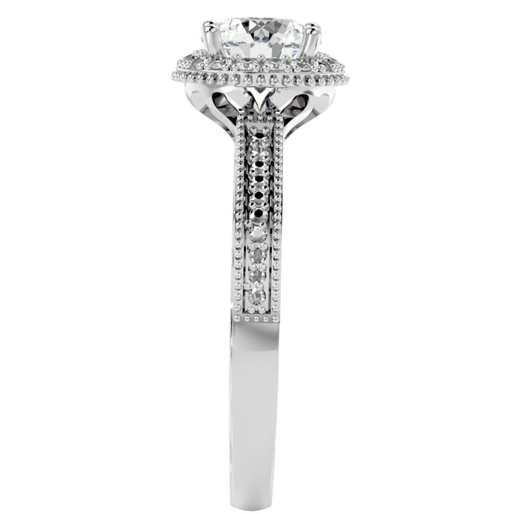 This 1 1/10Ct Vintage Diamond & Moissanite Halo Engagement Ring by Pompeii3 is a romantic design inspired by timeless elegance. A 6mm round brilliant-cut moissanite is surrounded by 48 round-cut diamonds, set in solid gold with a high-polished vintage finish.