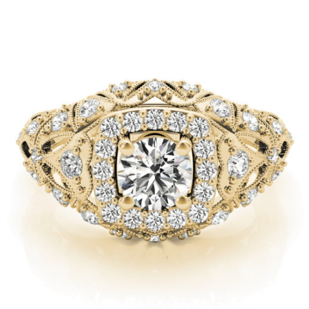 This 1 Ct Diamond Vintage Engagement Ring Lab Grown in 14k White, Yellow, or Rose Gold by Pompeii3 features a 1/2 ct round brilliant cut lab-grown diamond and 40 round-cut accent diamonds. The antique vintage-style setting in solid 14k gold creates a timeless design.