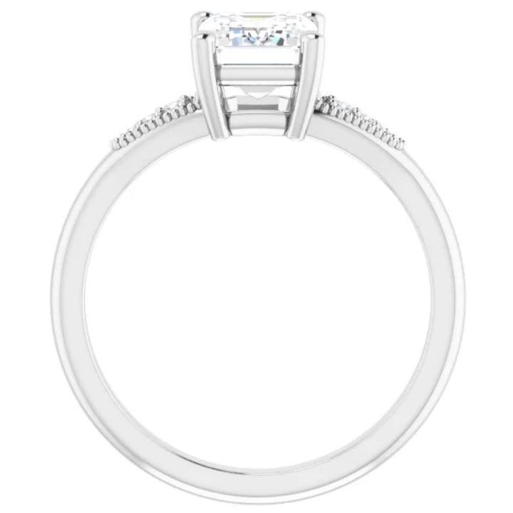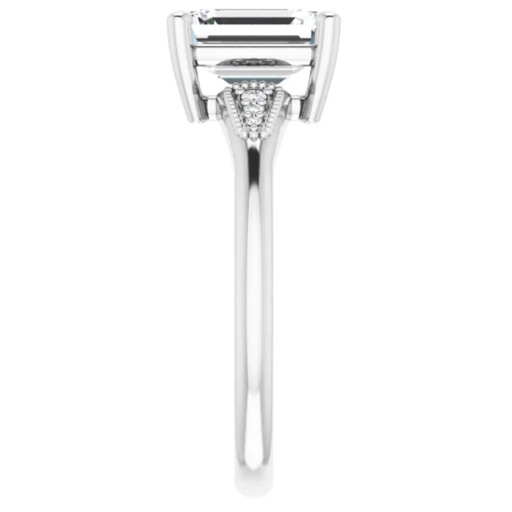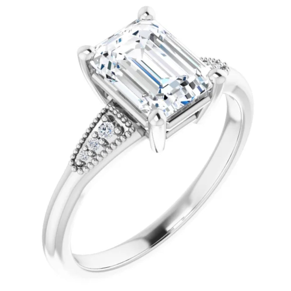 This 1 3/4Ct Diamond & Emerald Cut Moissanite Vintage Engagement Ring White Gold by Pompeii3 is a captivating and eye-catching choice for a special proposal. The 8x6mm emerald cut moissanite is complemented by six round brilliant cut diamonds, creating a vintage-inspired design. Set in solid 14K white gold, this ring combines sophistication with a timeless elegance, making it perfect for an unforgettable engagement.