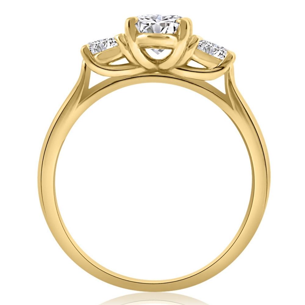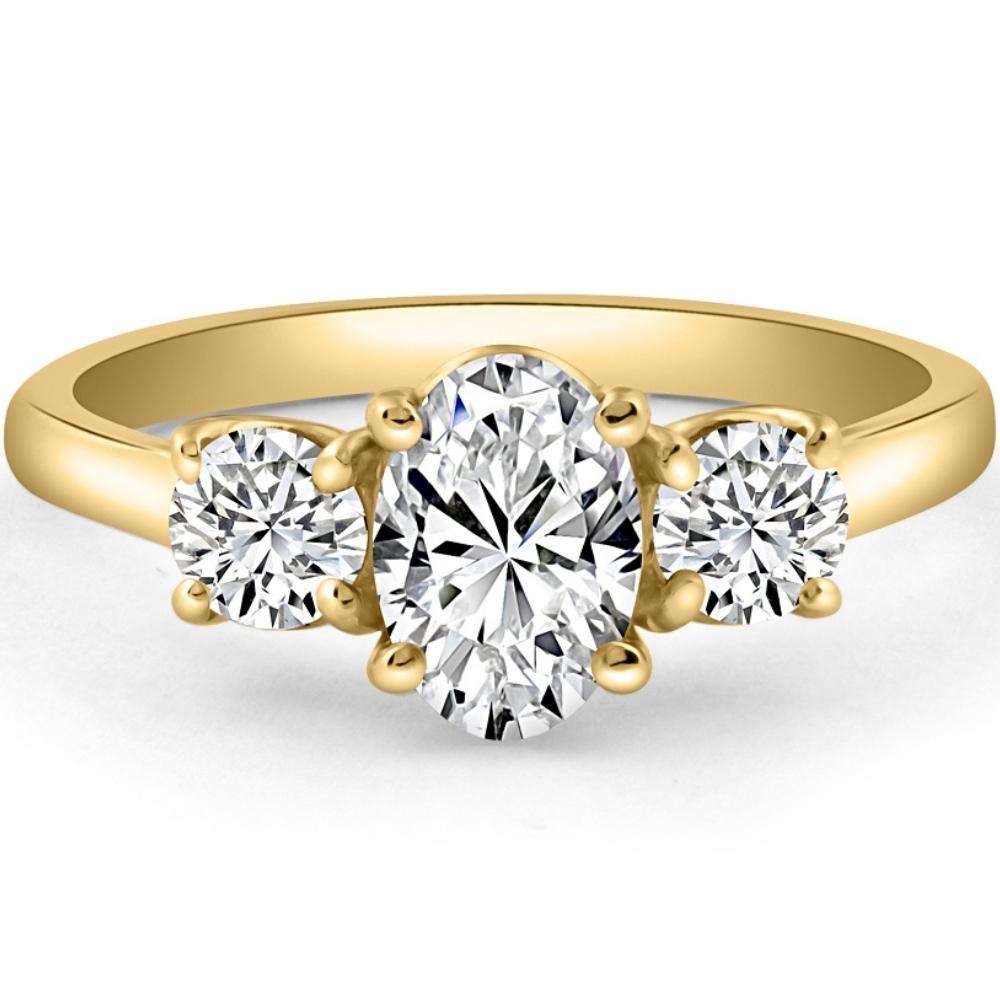 Made from solid 10K white or yellow gold, set with a 1 1/4ct center oval brilliant-cut lab-grown diamond and two round-cut lab-grown diamonds totaling 2ct. The diamonds are prong set for a secure and elegant look.