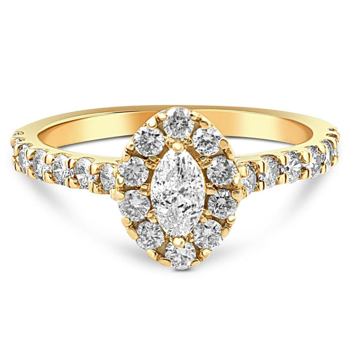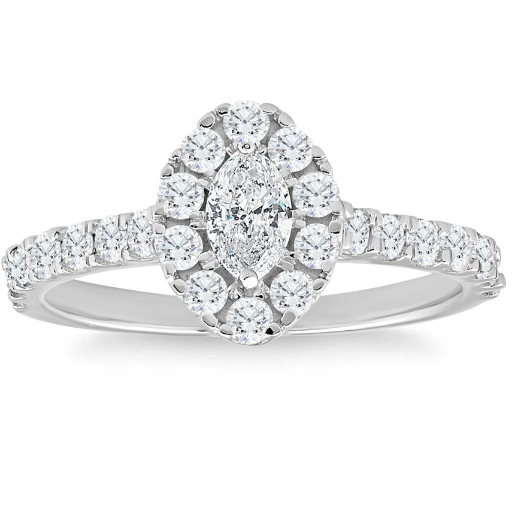 This 1Ct TW Marquise Diamond Halo Engagement Ring by Pompeii3 features a 1/3ct marquise diamond at the center, surrounded by 24 round-cut diamonds. Set in solid gold, this ring is a timeless piece that offers both elegance and durability, perfect for an engagement or special occasion.