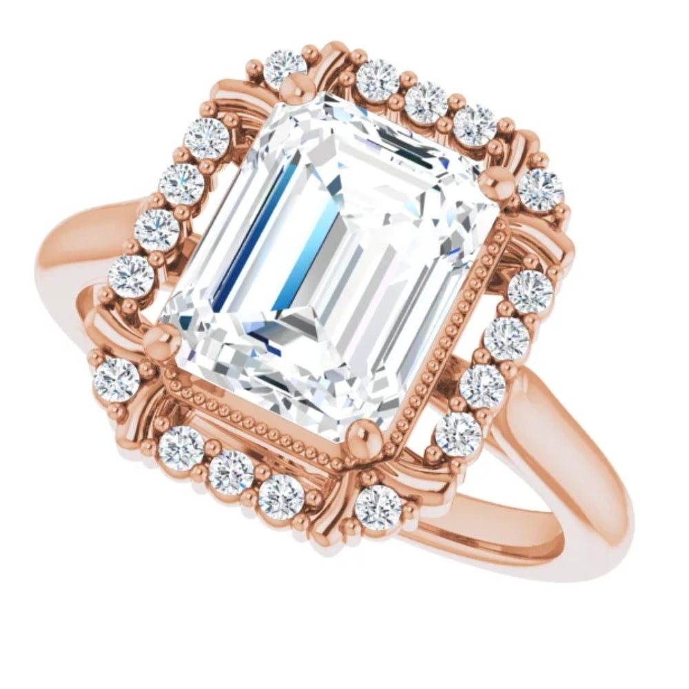 This 4 1/4 Ct Emerald Moissanite & Diamond Engagement Ring in White, Yellow, or Rose Gold by Pompeii3 features a 7x9mm emerald-cut moissanite, surrounded by 18 round-cut diamonds. The high-polished solid gold setting creates a striking, luxurious design that will be cherished forever.