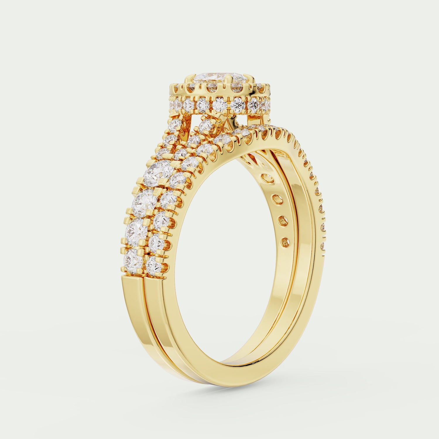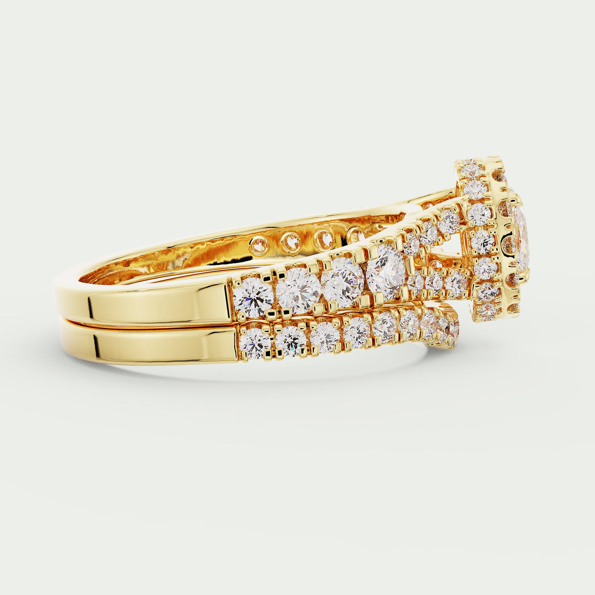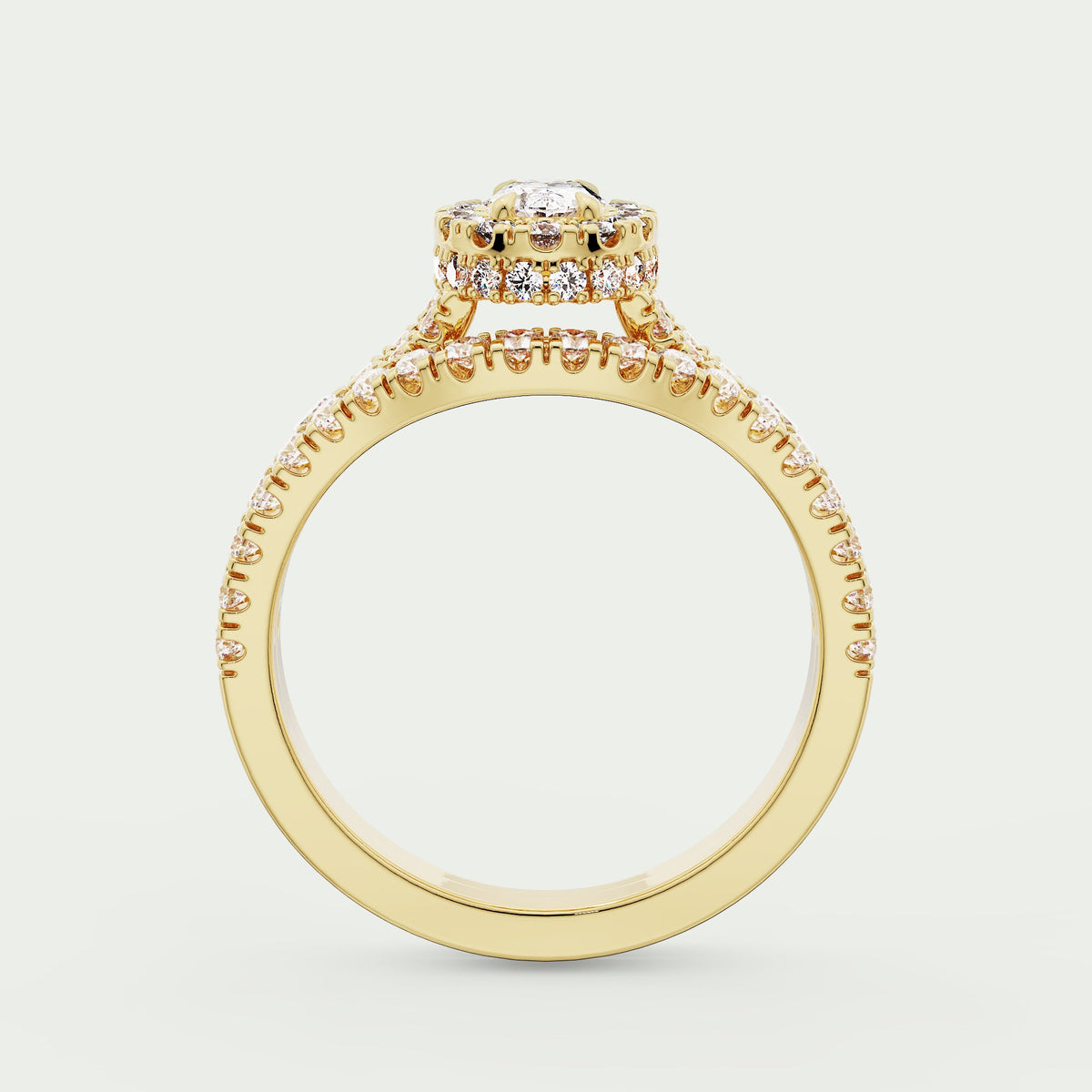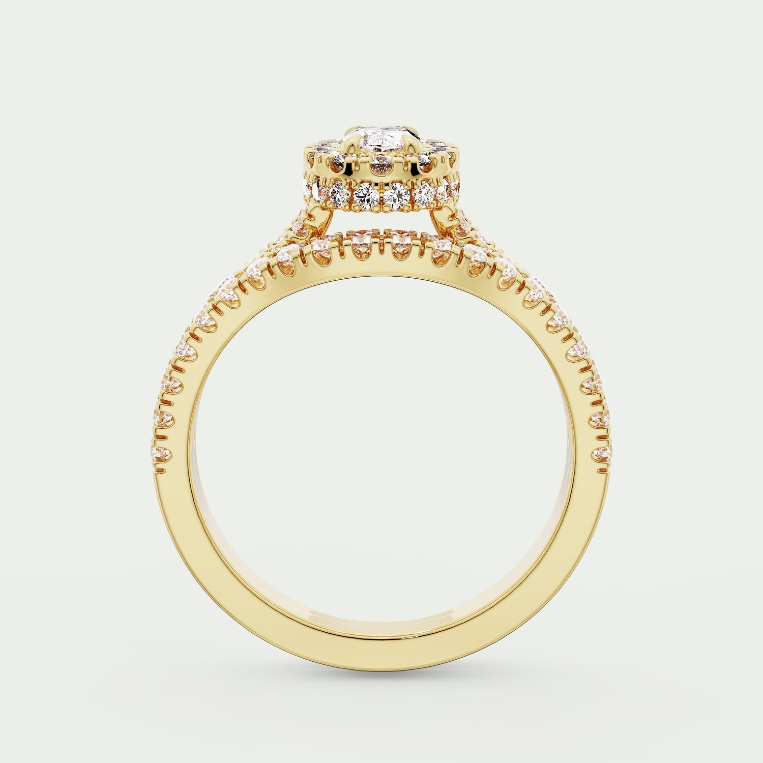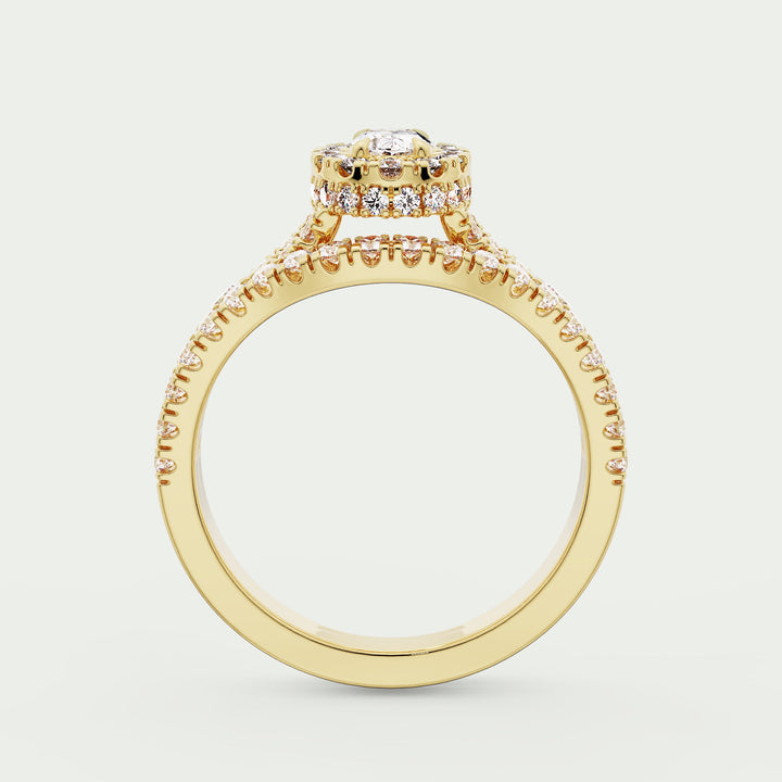 This 1 1/4Ct Lab Grown Oval Diamond Engagement Wedding Ring Set in White or Yellow Gold by Pompeii3 showcases a 1/5 carat oval brilliant cut lab-grown diamond, surrounded by 68 round cut diamonds. Set in a high-polish 10K gold mounting, the matching wedding band completes this elegant set.