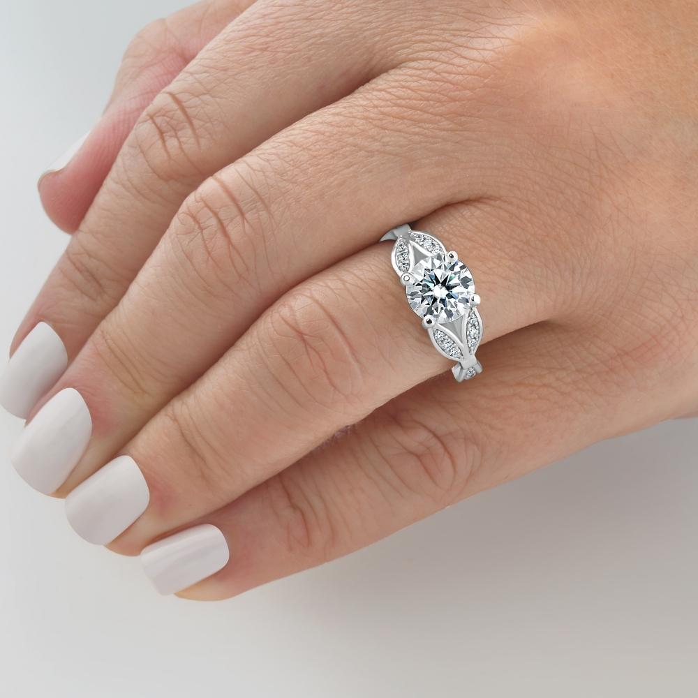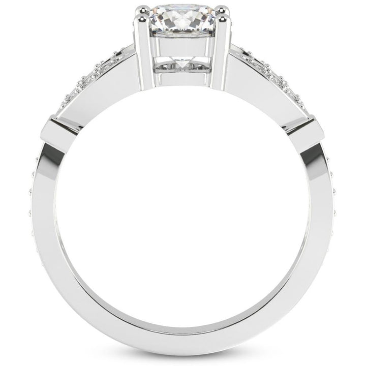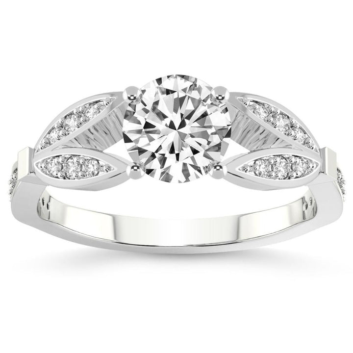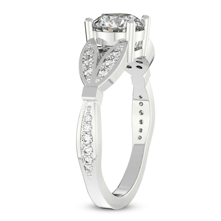 This 2 1/5Ct Diamond Willow Lab Grown Engagement Ring in White, Yellow, or Rose Gold by Pompeii3 features a 2 1/4ct round brilliant-cut lab-grown diamond, complemented by 24 round side stones. The prong-set diamond is set in solid gold, with a high-polish vintage petal-style mounting.