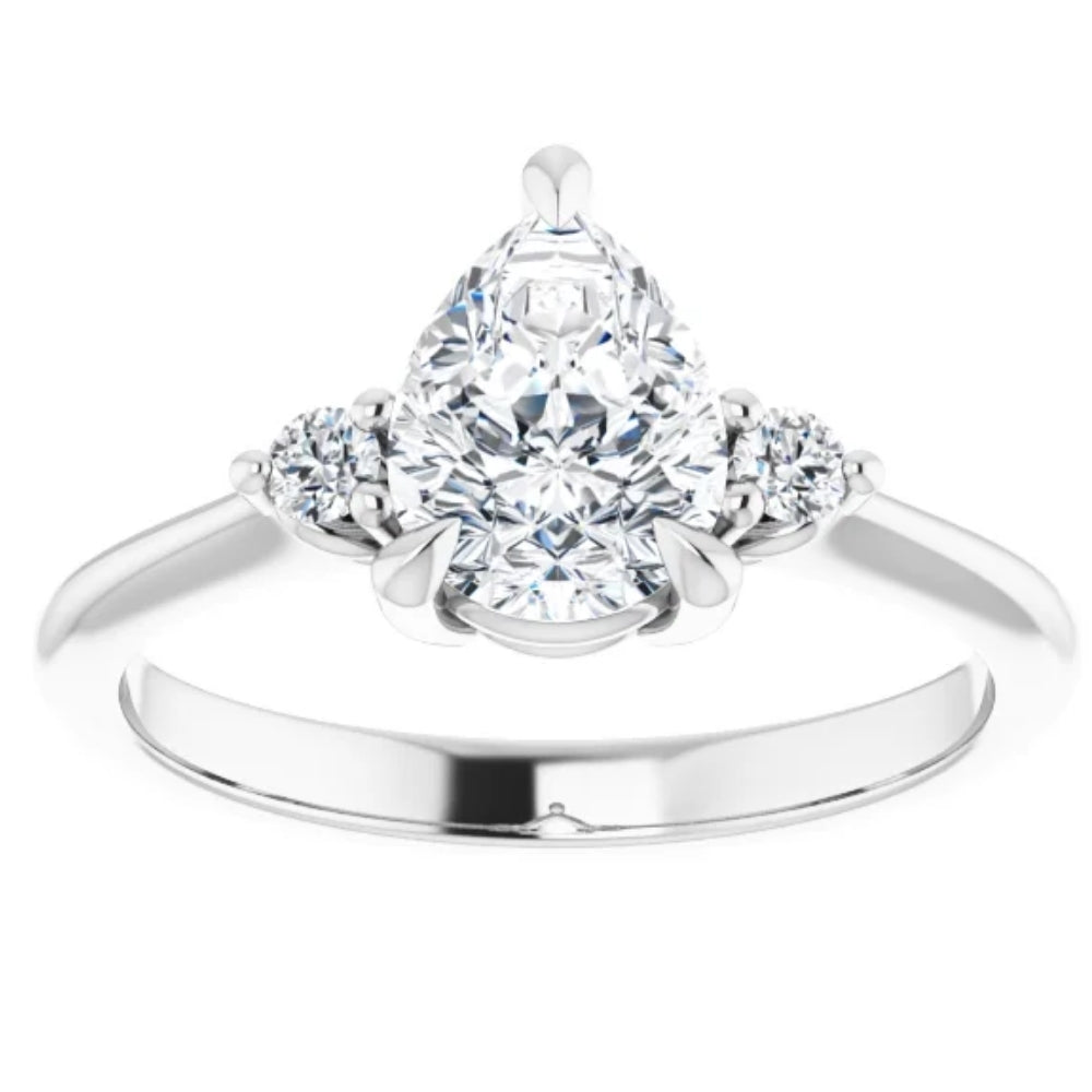 Handcrafted in solid 14k white, yellow, or rose gold with a 1ct pear-shaped lab-grown diamond and two round-cut lab-grown diamond accents. Diamonds graded VS clarity, G-H color. Prong-set in a polished three-stone design.