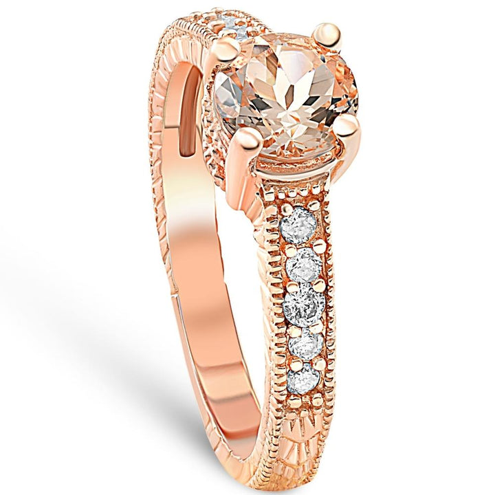 Made from solid 14K rose gold, featuring a 6mm round brilliant-cut morganite and 10 round brilliant-cut diamonds totaling 1ct. The stones are prong set in a polished vintage-style mounting.