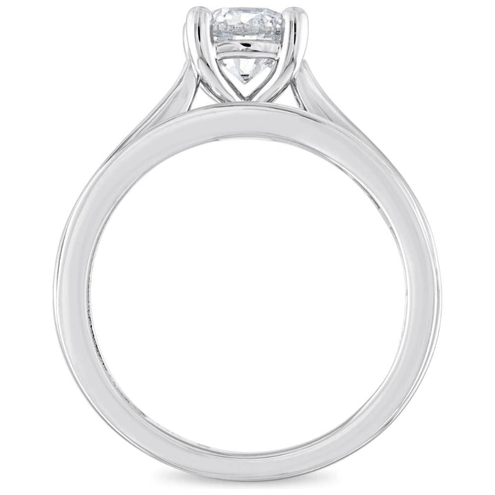 Crafted in 10K white gold, featuring a 3/4ct round brilliant cut diamond with side channel-set diamonds totaling 2 carats.