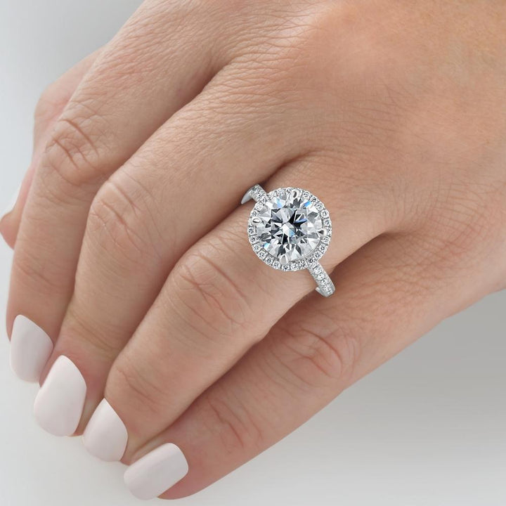 This 4 1/2Ct Diamond Halo Lab Grown Engagement Ring by Pompeii3 is an opulent masterpiece of brilliance and sophistication. Showcasing a 4ct round brilliant-cut lab-grown diamond, surrounded by 63 shimmering side stones, this classic design is available in white, yellow, or rose gold and radiates timeless luxury.