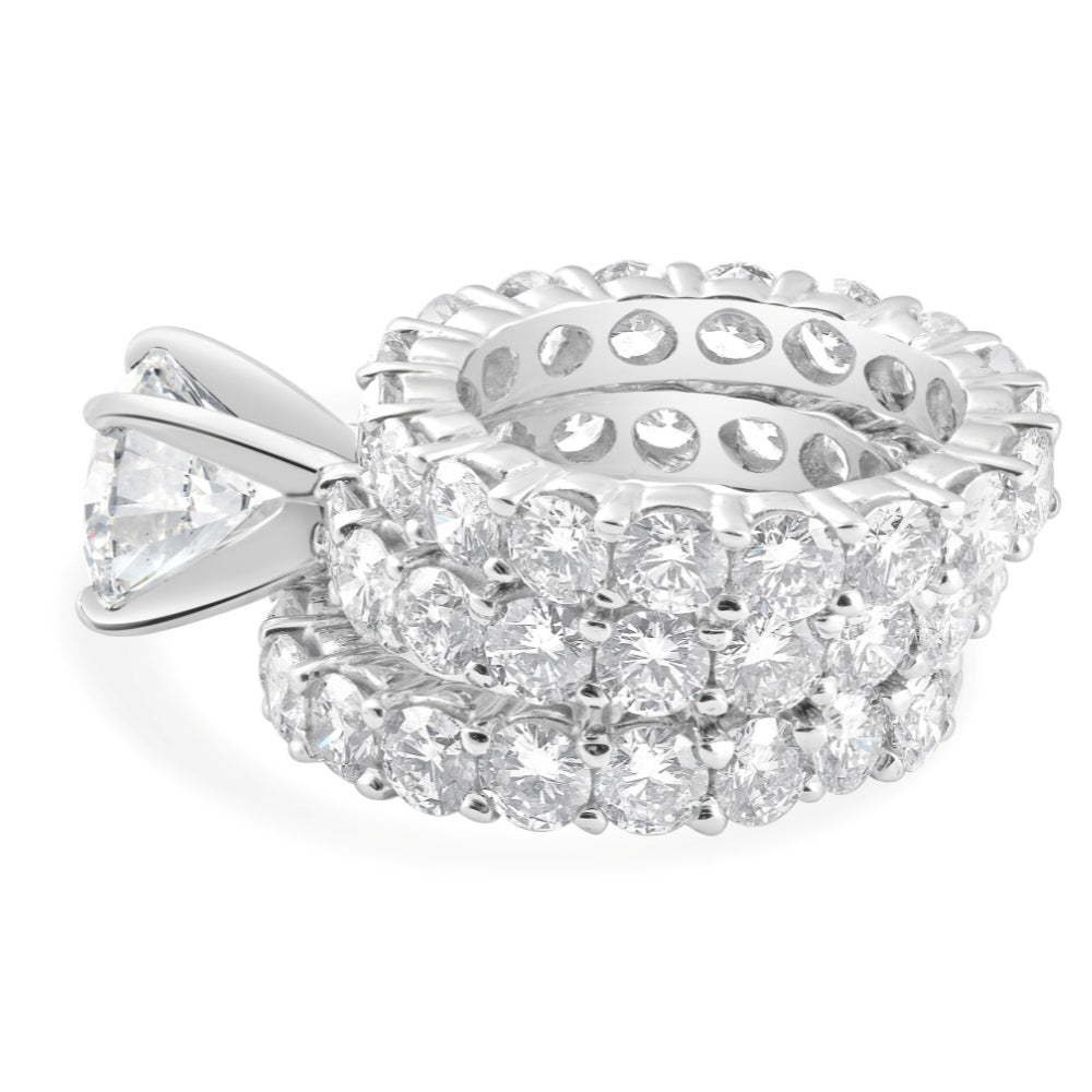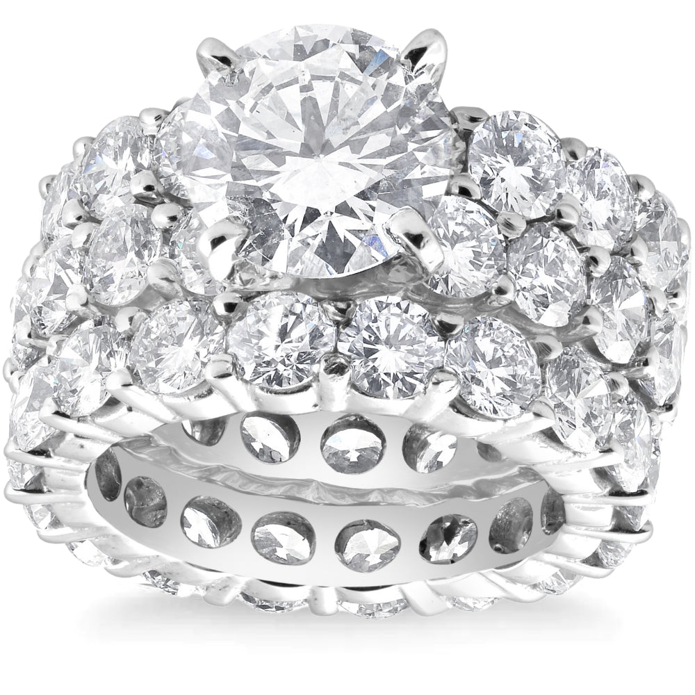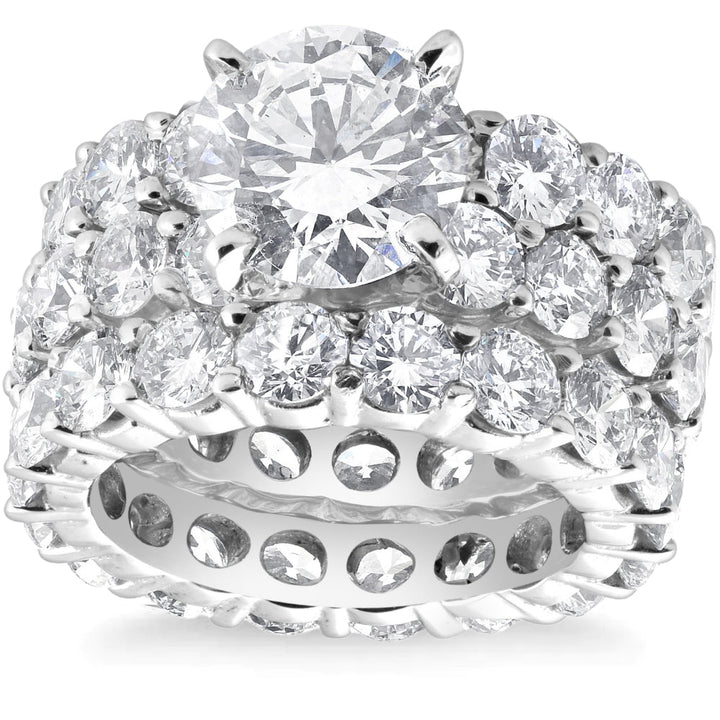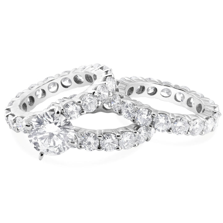 This 15Ct TW Diamond Eternity Engagement Wedding Ring Set in 14k White Gold Lab Grown by Pompeii3 features a stunning 3ct round cut lab-grown diamond at the center, flanked by round-cut accent diamonds. The diamonds are prong set in a solid 14k white gold mounting that encircles the entire ring. This set includes two matching bands.