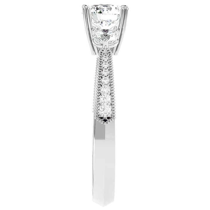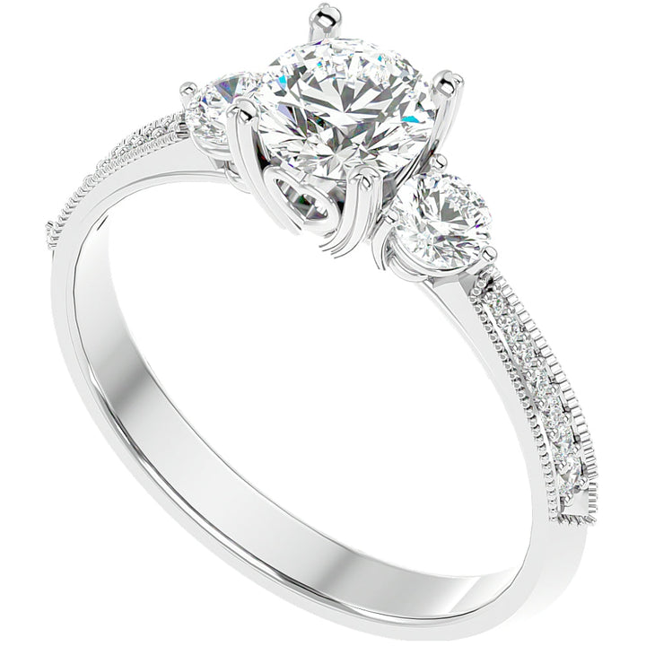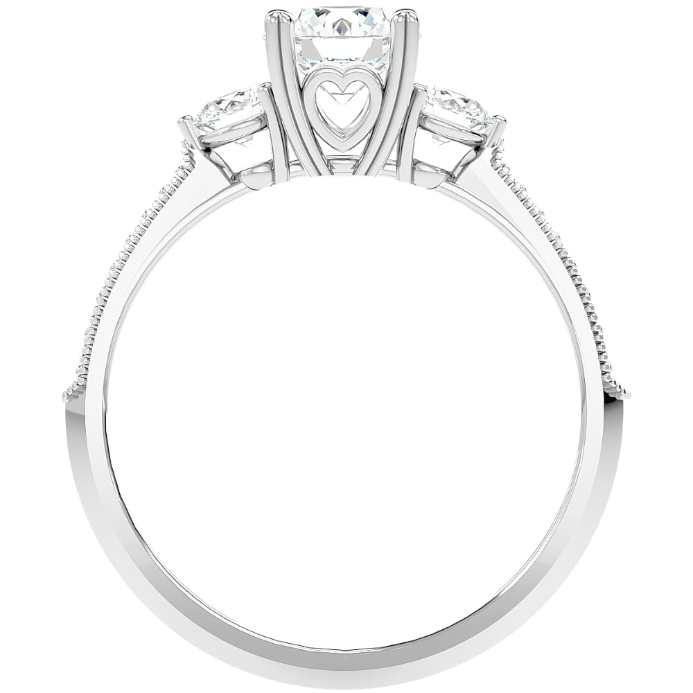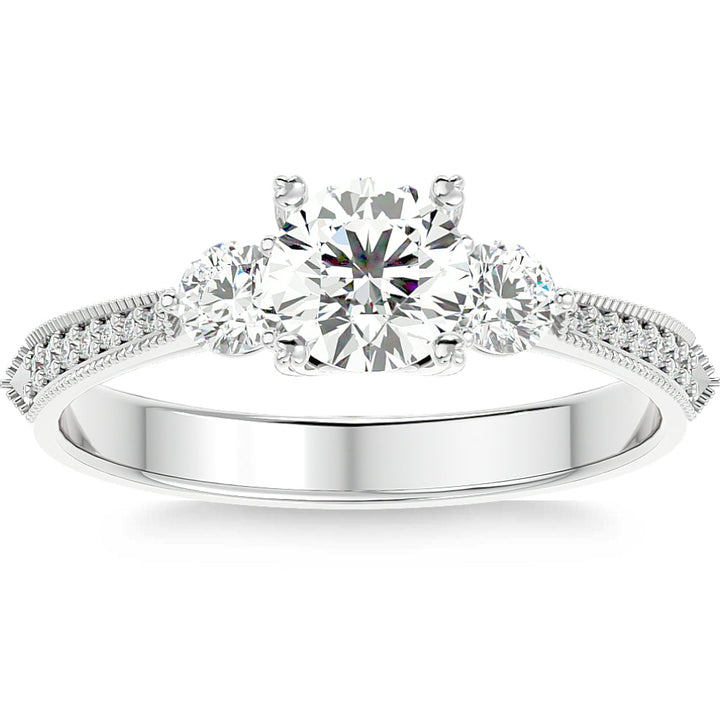 This 1 1/10Ct Diamond & Moissanite Accent Engagement Ring in 10k Gold by Pompeii3 combines a stunning 6mm round brilliant cut moissanite with round brilliant cut diamonds, all set in solid 10k white gold. The polished finish and high-quality materials make this ring a timeless choice for engagements.