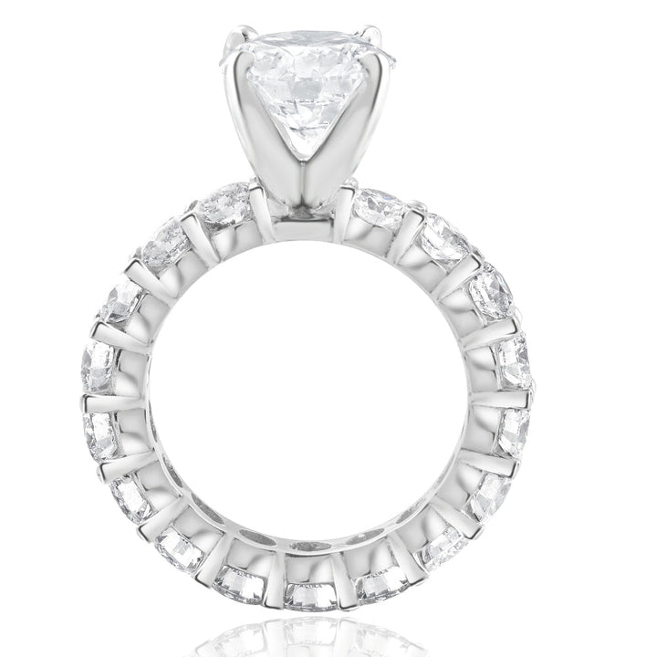 This 5 1/2Ct TW Round Cut Diamond Eternity Engagement Ring in 14k White Gold Lab Grown by Pompeii3 features a 1 1/2ct round cut lab-grown diamond. The center stone is flanked by round-cut accent diamonds, all prong set in solid 14k white gold high-polished mounting that encircles the entire ring.