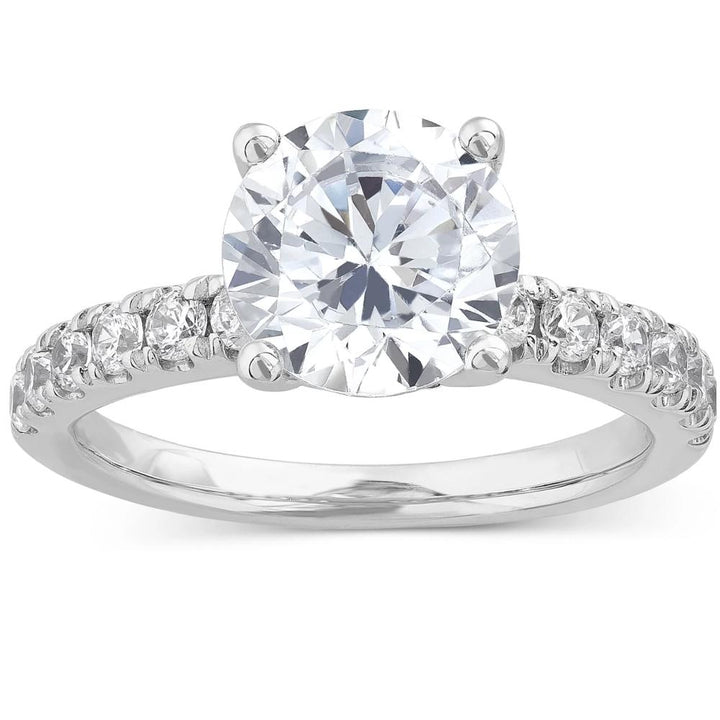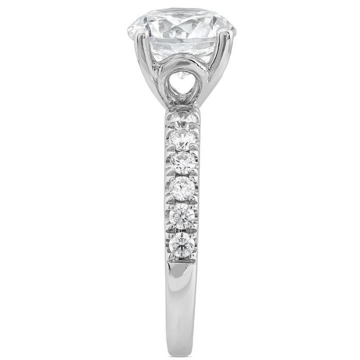 This Certified 4Ct TW Diamond Pave Engagement Ring by Pompeii3 features a 3ct round brilliant-cut lab-grown diamond as the centerpiece, accented with round-cut lab-grown diamonds. The diamonds are prong set in solid 14K white gold, creating a stunning pave effect. This elegant design is perfect for engagements, showcasing both brilliance and sophistication.