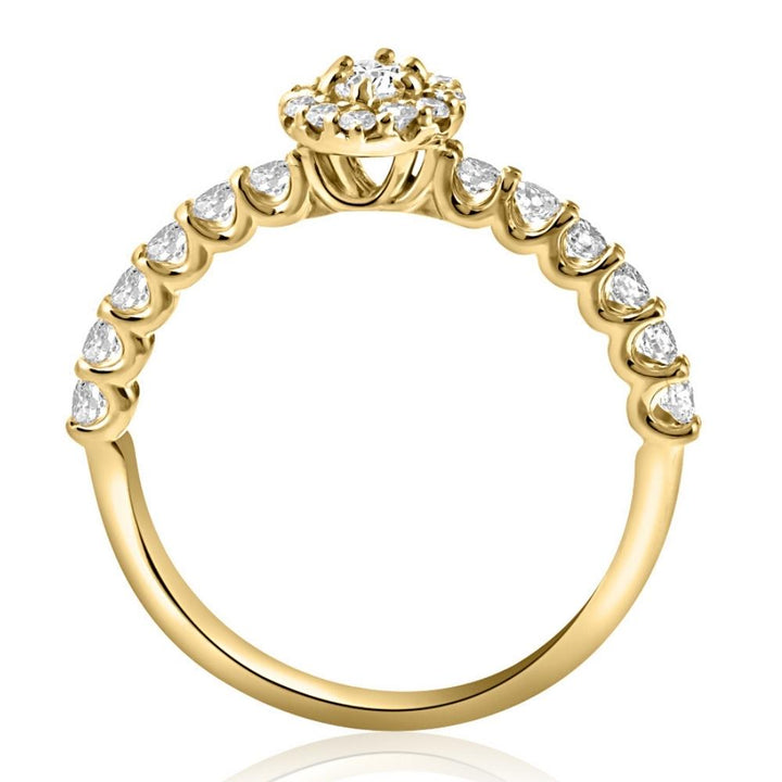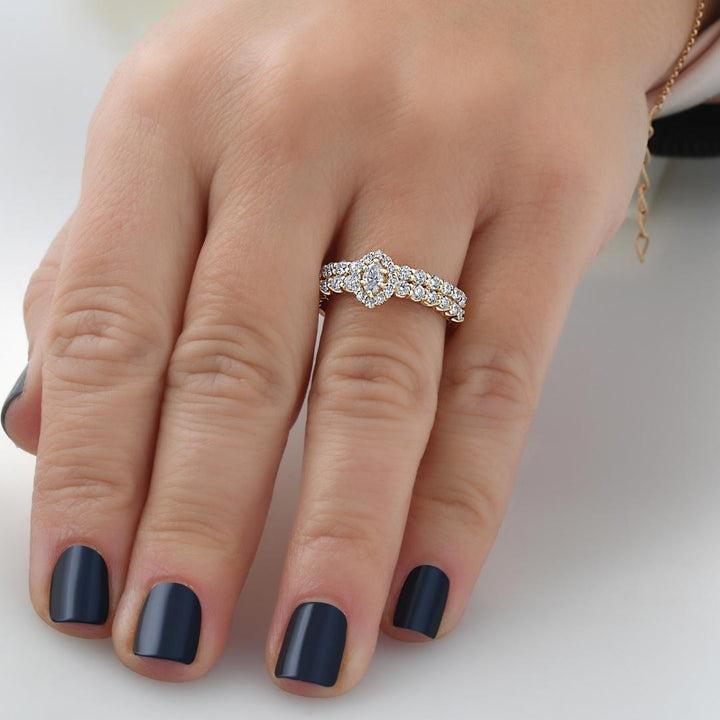 This 1 1/4Ct Marquise Halo Diamond Engagement Wedding Ring Set in White or Yellow Gold by Pompeii3 features a stunning marquise center diamond, flanked by 24 round brilliant cut diamonds. The diamonds are set in a solid 10k yellow gold band, with a high-polished finish that adds elegance and shine. The matching wedding band is included, making this a perfect engagement and wedding ring set for an enduring commitment.