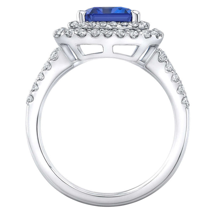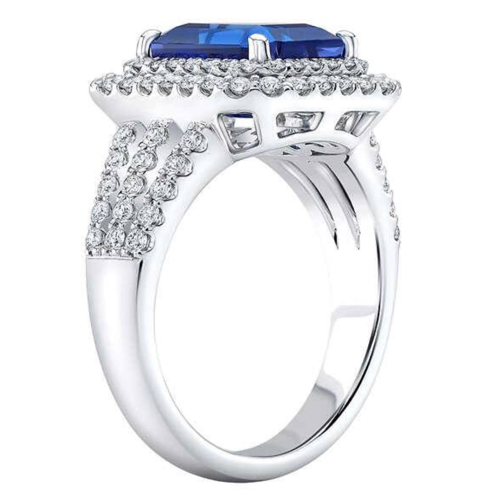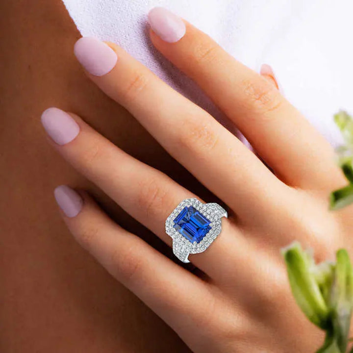 This 4 1/2Ct TW Emerald Cut Tanzanite & Lab Grown Diamond Ring by Pompeii3 features a stunning 10x8mm created tanzanite at It's center, accented by 88 sparkling diamonds. Set in solid 14K white gold with a high-polished prong setting, this ring adds a pop of color and elegance to any collection. Perfect for those who appreciate vibrant gemstones paired with the brilliance of diamonds.