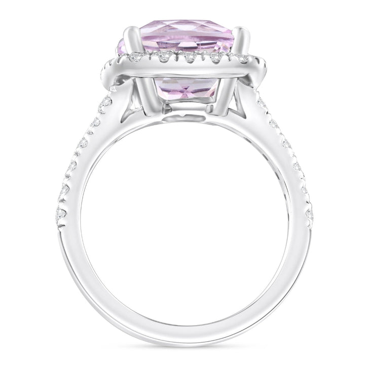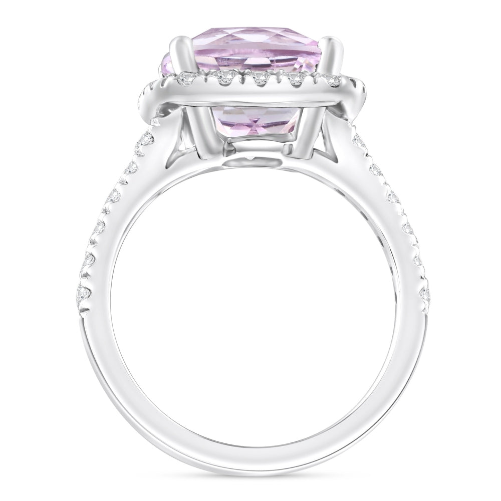 Handcrafted in solid 14k gold with a 10mm cushion-cut pink kunzite gemstone and round diamond accents. Diamonds graded VS clarity, F-G color. Prong-set in a polished halo design.