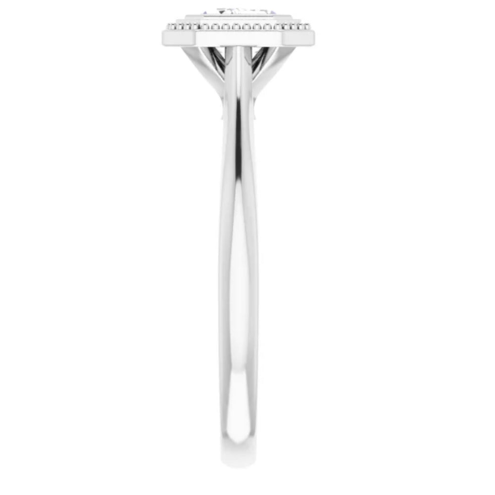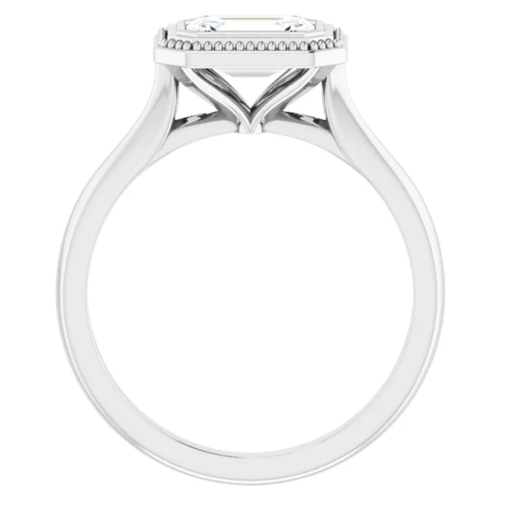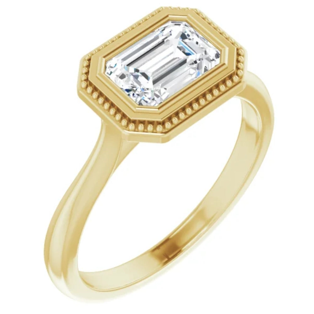 Made from solid 10K white, yellow, or rose gold, featuring an 8x6mm emerald-cut moissanite totaling 1 3/4ct. The moissanite is bezel set with small beading for a unique look.
