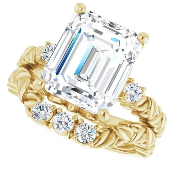 5 1/2 ct Diamond & Emerald Cut Moissanite Petite Leaf Engagement Set in Gold