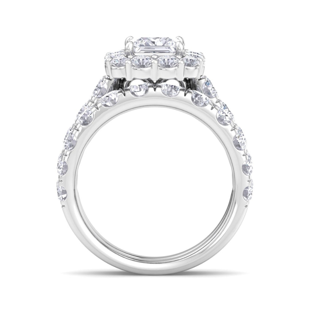 This 5Ct Princess Cut Diamond Engagement Matching Wedding Ring Set in 10K Gold by Pompeii3 is the epitome of elegance. The 1-carat princess square cut lab-grown diamond center stone is surrounded by prong-set side stones, creating a bold and luxurious design. The high-polished gold band complements the diamonds' brilliance, while the matching wedding ring ensures a seamless look. This engagement ring set is designed for those seeking a statement piece that exudes sophistication and class.