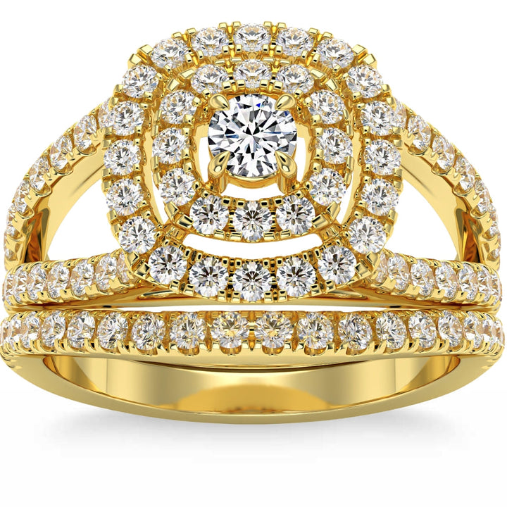 This 1 3/4Ct Natural Diamond Cushion Halo Engagement Wedding Ring Set in 10k Gold by Pompeii3 is a stunning piece featuring a 1/5ct round brilliant cut diamond surrounded by 90 round cut accent diamonds. The diamonds are prong set in solid 10k gold, with a high-polished band and a split band design on top, adding a modern twist to this timeless ring. The matching wedding band is included, making it a perfect choice for an engagement or wedding.