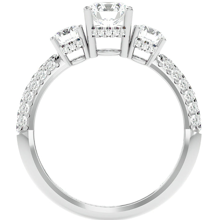 This 1 1/2Ct Diamond & Moissanite Side Halo Engagement Ring by Pompeii3 features a 6mm round brilliant-cut moissanite center stone, surrounded by round brilliant-cut diamonds. The stones are set in a solid 10K white gold mounting with a high-polished finish, creating a sleek and elegant design.