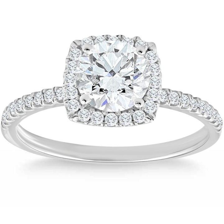 Handcrafted in solid 14k white gold with a 7mm round genuine moissanite and round cut natural diamonds totaling 1.75ct. Prong-set cushion halo.